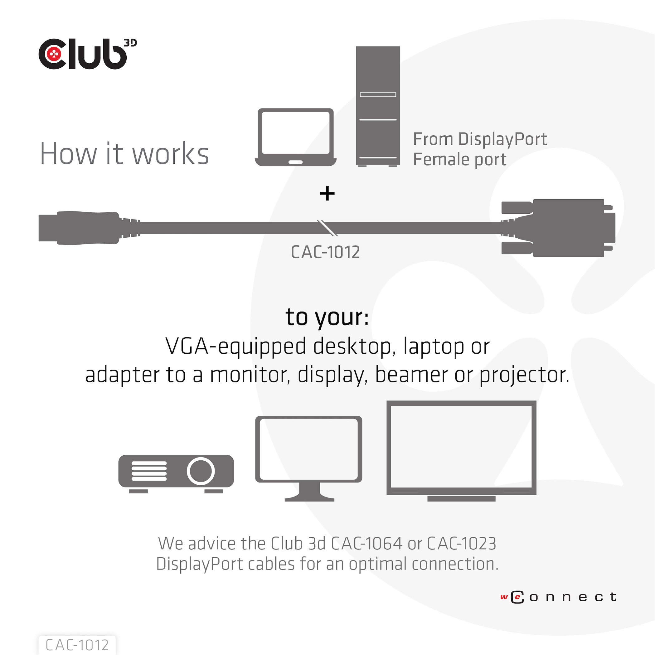 The Club 3D CAC-1012 DisplayPort™ to VGA Cable M/M 2m/6.56ft 28AWG links any DisplayPort™-equipped desktop, laptop or adapter to a monitor, display, beamer or projector with a 15-pin VGA Female port. Ideal for at home or work, the cable creates a reliable connection for anything from gaming to video projection and supports up to Full HD 1080p(max. resolution of 1920 x 1080). A Micro USB port is also provide for External Power. This quality DisplayPort™ to VGA cable provides superior performance thanks to the combined effect of its Gold plated connectors and 28 AWG conductors. Internal shielding provides reduced crosstalk, suppresses noise, and helps prevent electromagnetic interference (EMI) and radio frequency interference (RFI).Experience a reliable, high-quality connection with this convenient DisplayPort™ to VGA 2m/6.56ft cable.