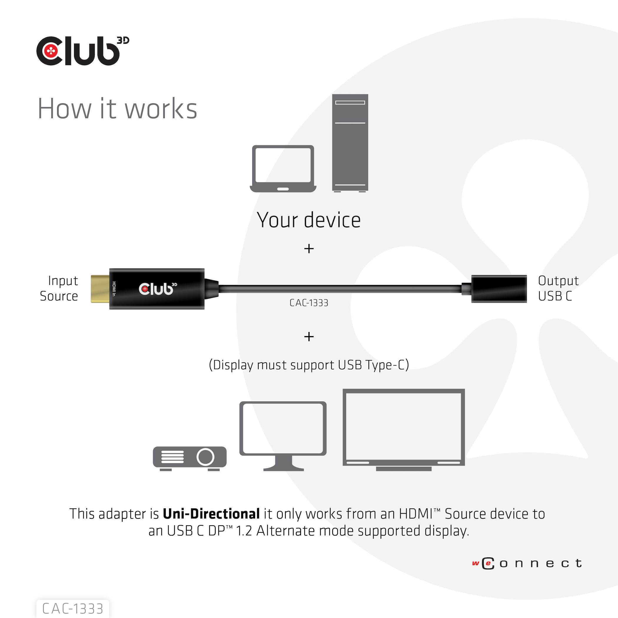 The Club 3D CAC-1333 is a HDMI™ to USB-C Adapter which allows you to transmit signal from HDMI™ source (Laptop, tablet, PC etc.) to USB-C display devices(TV, monitor, projector, etc.) through a Type-C M/M Cable. This adapter is Uni-Directional it only works from an HDMI™ Source device to an USB C DP™ 1.2 Alternate mode supported display. This product supports DP™1.2 specification with resolution up to 4096 x 2160@60Hz.