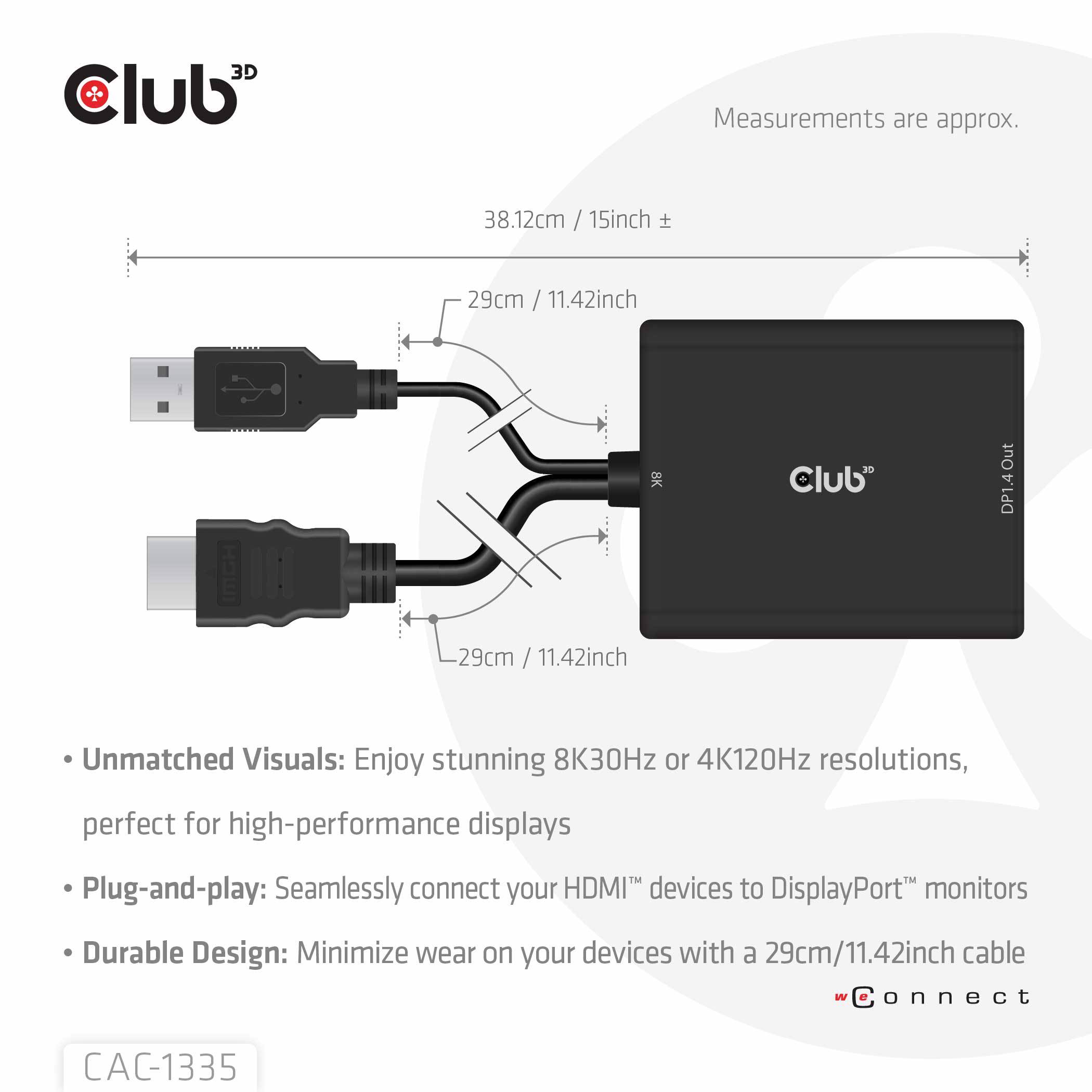 If you have a PC or any other device that lacks the new DisplayPort™ 8K30Hz or 4K120Hz specifications, the Club3D CAC-1335 will be the simple way to connect your HDMI™ source device to your new 4K120Hz or 8K30Hz display(provided your source supports these resolutions).