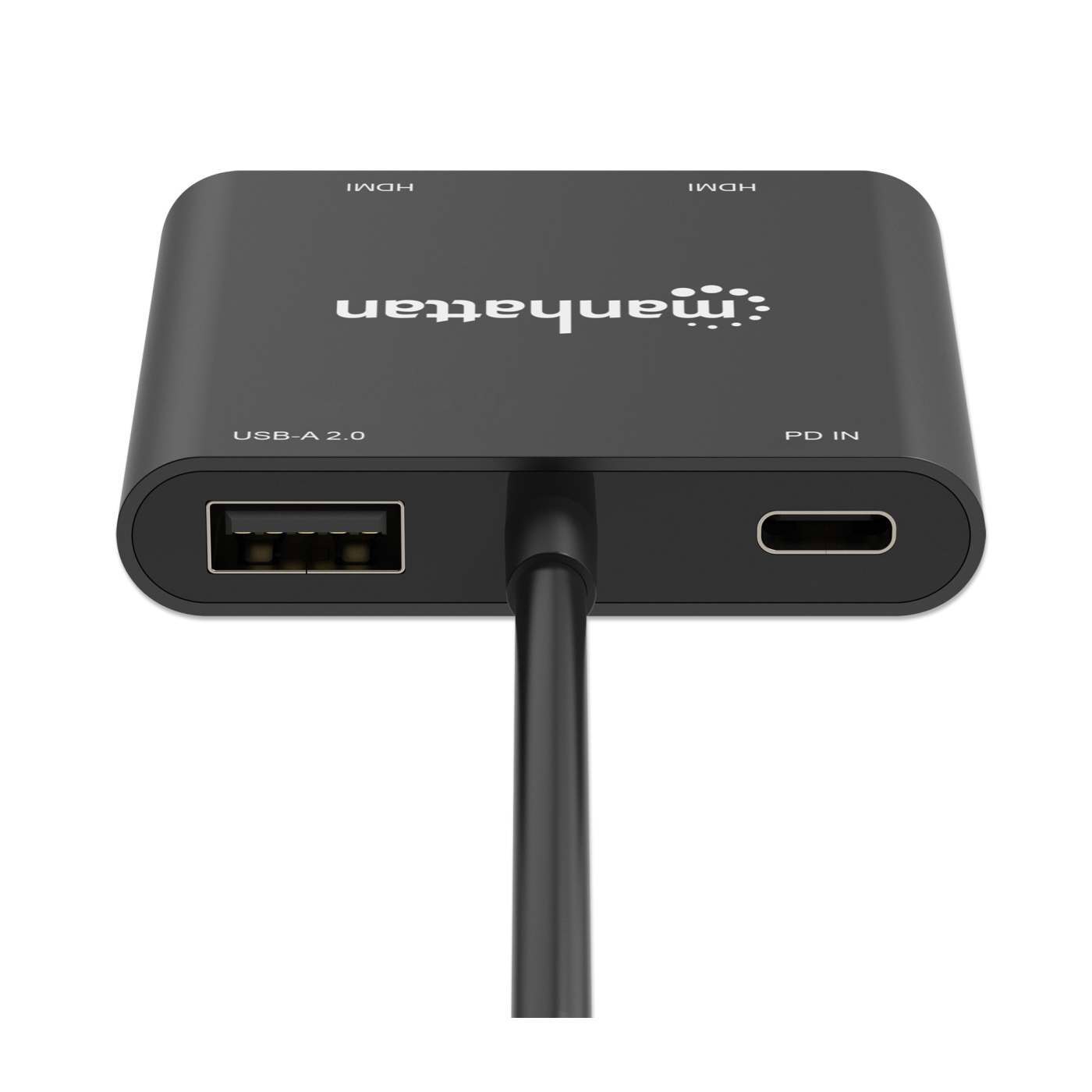 Be more productive with the Manhattan USB-C PD to Dual-HDMI Monitor Adapter for Laptop and Tablet. This versatile adapter lets you connect your USB-C device to two HDMI displays while simultaneously charging it with up to 100 W, ensuring you stay powered up and ready for anything.