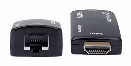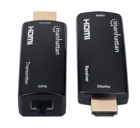 The Manhattan 1080p Compact HDMI over Ethernet Extender Kit can connect nearly any digital HDMI source (e.g., gaming console [PlayStation®, Xbox® and more], Blu-ray player, satellite receiver, digital recorder, etc.) to an HD display or projector at a distance up to 60 m (196 ft.) with one Cat6 Ethernet cable. The Kit provides reliable 1080p@60Hz resolution video and multichannel audio transmission over longer distances than HDMI cables alone. Its slim and compact design is ideal for installations in confined spaces or virtually anywhere.