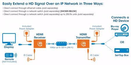 The Manhattan 1080p HDMI over IP Extender Kit is the ideal solution for connecting virtually any digital HDMI source (PlayStation, Xbox, Blu-ray player, satellite receiver, digital recorder, etc.) to an HD display or projector up to 120 m (396 ft.) away using an IP network and a single Ethernet cable. This powered HDMI over IP Extender Kit provides reliable 1080p resolution video and multichannel audio transmission over longer distances than HDMI cables alone. Plus, the transmitter and receiver modules have additional 3.5 mm ports for Infrared (IR) to allow for the control of the source from the display's location.