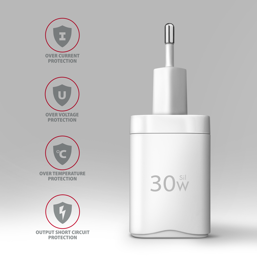 Compact size and high performance is given by the new Sil technology used. Super silicon uses advanced silicon-based materials. The charger can thus achieve smaller dimensions and at the same time safe, stable and fast charging. The efficiency is thus identical to GaN technology while maintaining a favorable price. The charger is equipped with Power Delivery 3.0 / Quick Charge 4+ USB Type-C and Quick Charge 3.0 USB Type-A outputs, enabling fast charging of smartphones and tablets with a power of up to 30W.