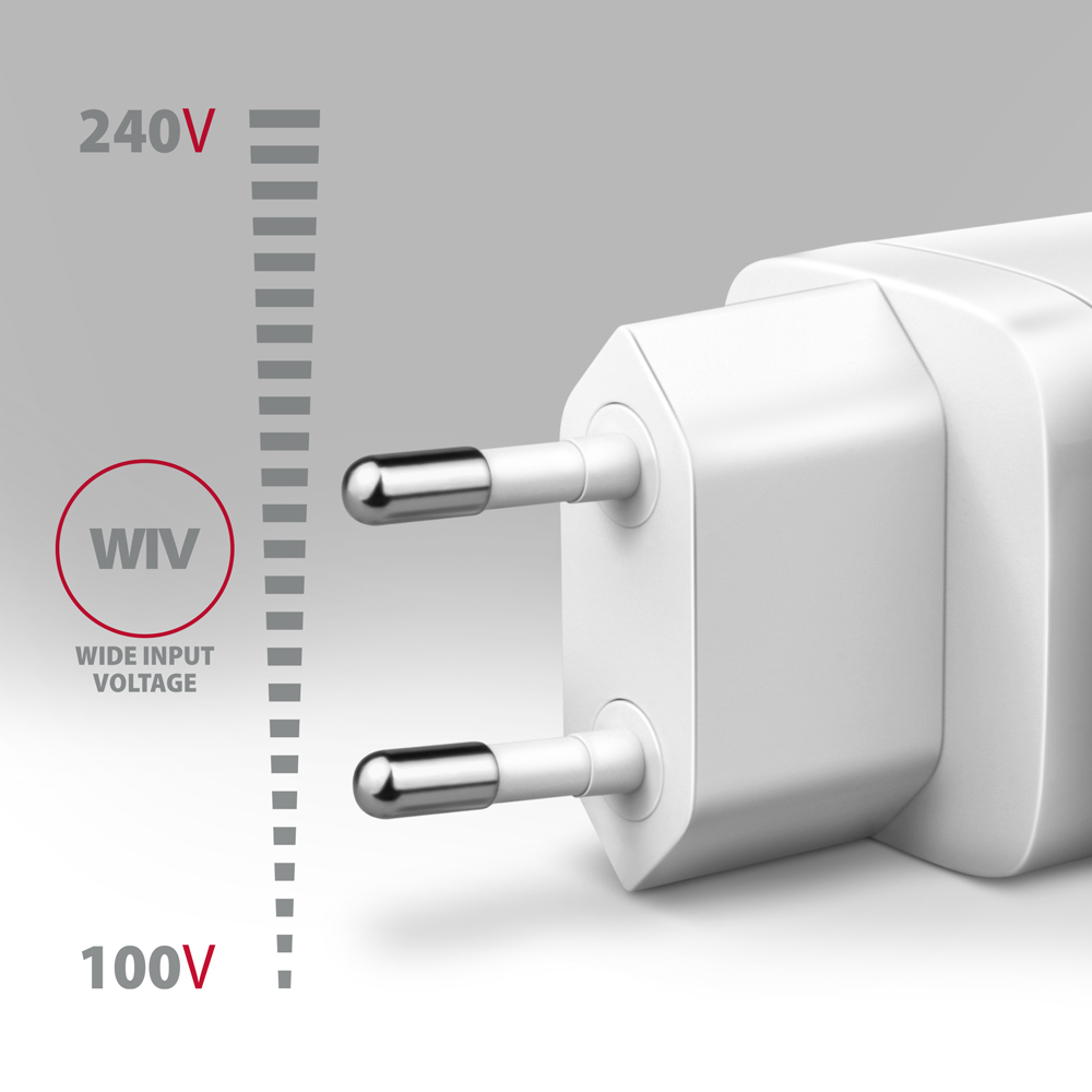 The body of the power adapter has a pleasant shape and size. Compared to classic charging adapters with same parameters, the size of the charger is a third smaller. The combination of small dimensions, achieved with Sil technology and a wide range of input voltages, makes the charger an ideal travel helper.