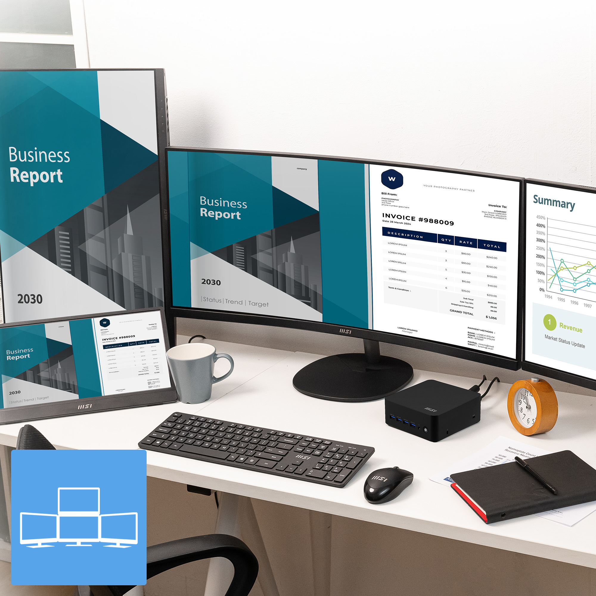 The MSI Cubi Z AI 8M combines AMD Ryzen™ 8000 Series with a built-in NPU in a compact 0.9-liter design. Features dual USB4 ports with speeds of up to 40Gbps, a 100W power delivery input, dual HDMI ports supporting up to four displays, dual 2.5G LAN ports for fast networking, a Kensington Lock for security, a built-in speaker, and a VESA mountable design.