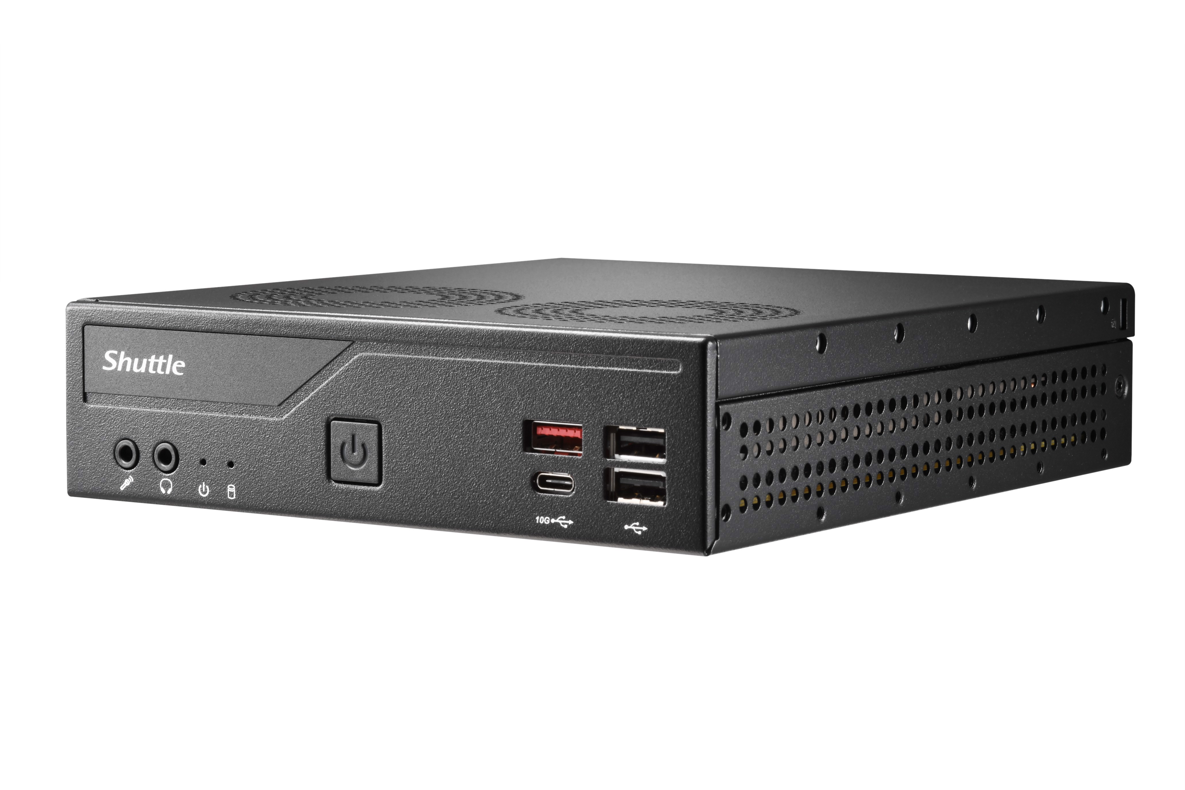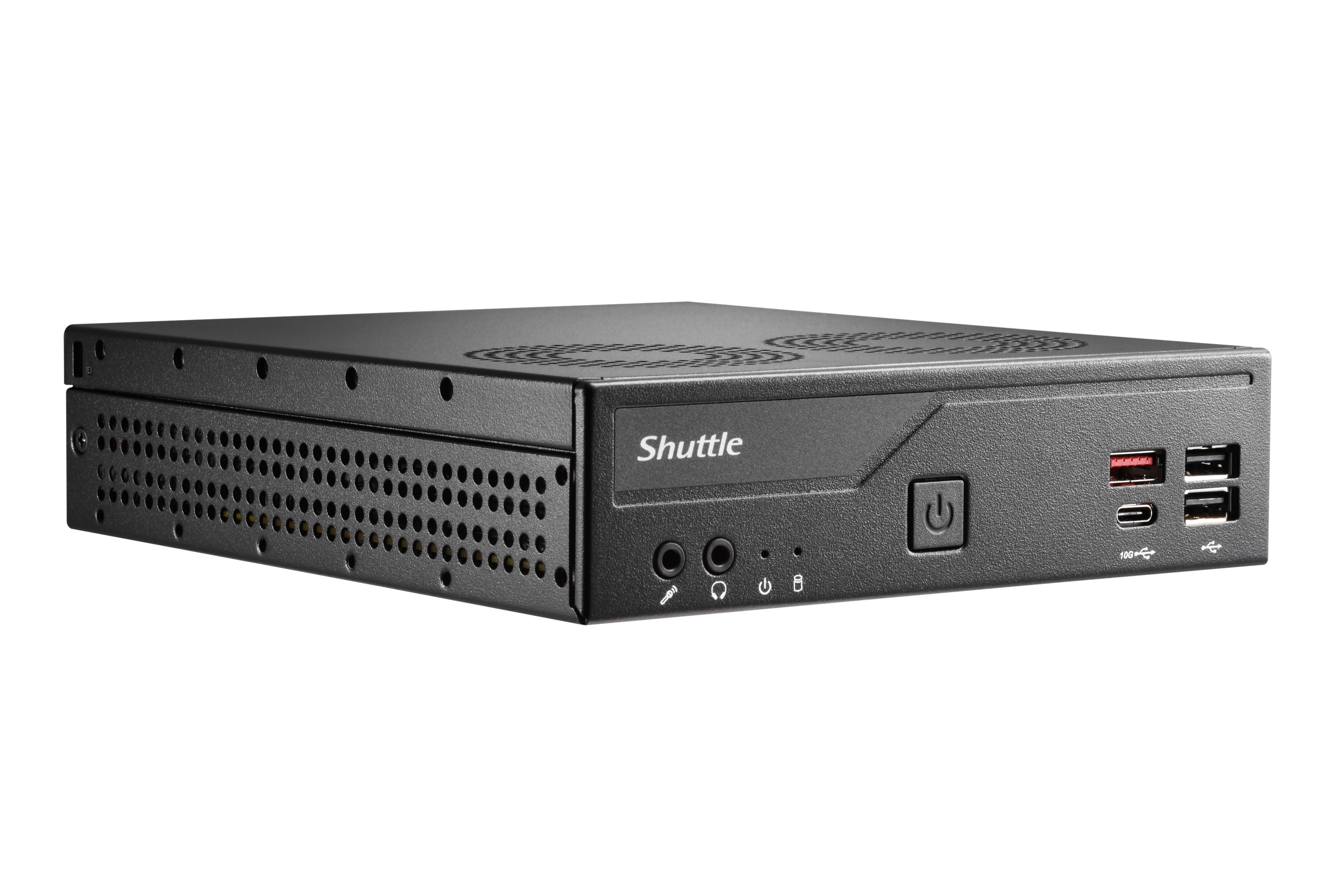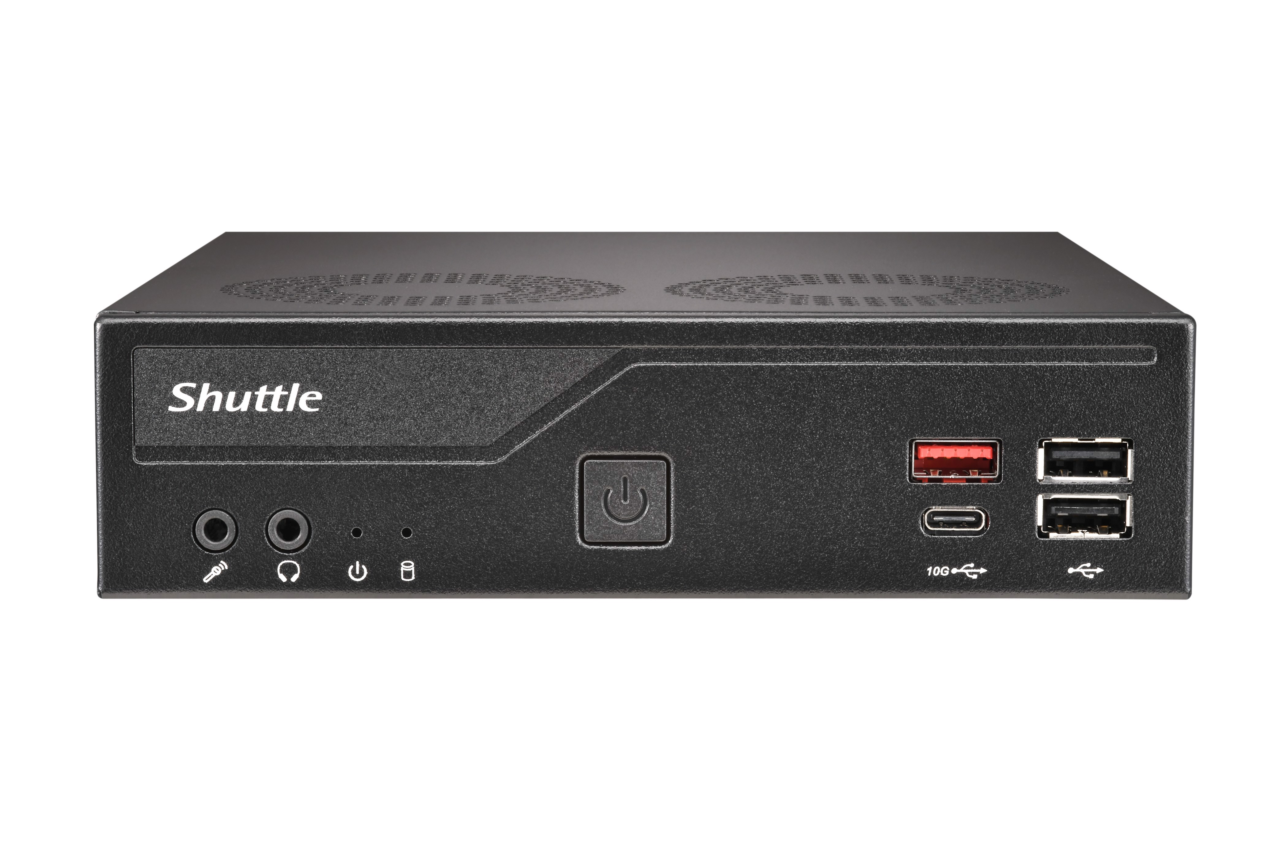 The Shuttle XPC slim Barebone DH810 is a robust 1.3-litre PC designed for powerful Intel Core Ultra 200 desktop processors (LGA1851 socket, “Arrow Lake-S”) with an integrated AI accelerator (NPU). Three independent display outputs – HDMI 2.1 supporting up to 8K/60 Hz, DisplayPort 1.4a, and USB-C with DisplayPort/USB4 – deliver stunning visuals for digital signage, entertainment, or office environments. Dual Intel LAN (2.5G + 1G), eight USB ports, two COM ports, and versatile storage options (M.2 PCIe 4.0 x4/SATA and 2.5" bay) provide maximum flexibility. Its slim metal chassis with VESA mount ensures reliable 24/7 operation at ambient temperatures up to 50 °C, making it ideal for demanding applications such as AI workloads, digital signage, POS/POI, gaming, healthcare, industry, and office.