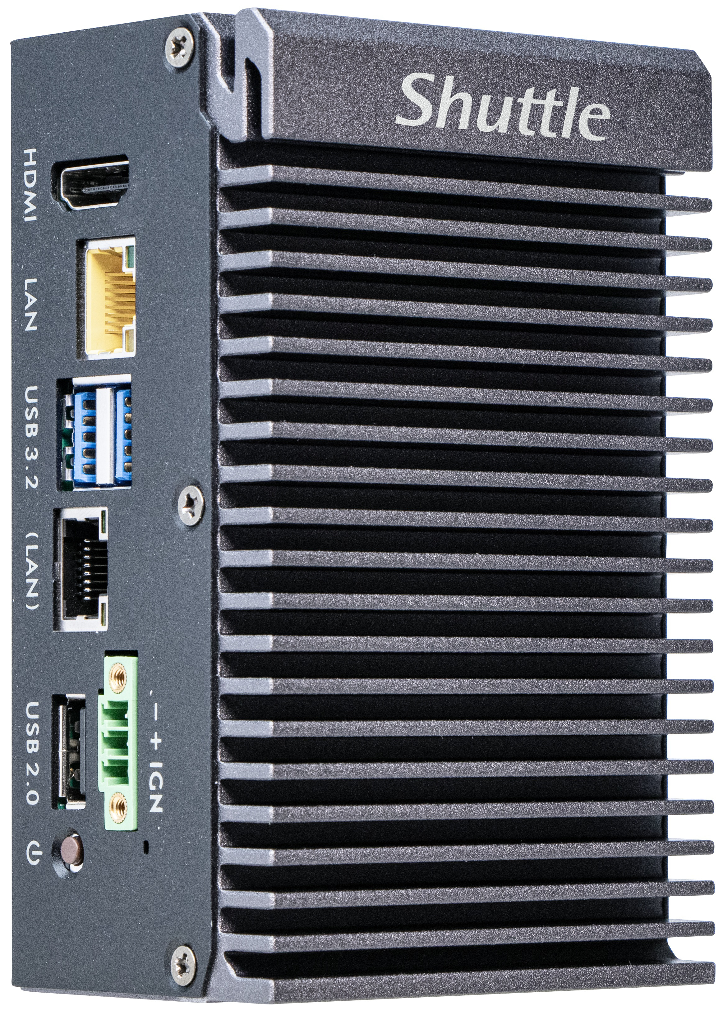 The Shuttle Edge PC SPCEL03 is a fanless IPC barebone in a robust 450 ml metal chassis and intended for DIN-Rail or VESA mounting. It is flexible in use and de-signed for maintenance-free 24/7 operation at ambient temperatures of up to 60°C. Inside there is an Intel Atom "Elkhart Lake" processor with slots for RAM module, M.2 SSD card and WLAN card. The small housing offers an amazing variety of connections, including dual LAN, COM port and Digital I/O. This product is targeted at professional applications such as edge computing (IoT gateway), automation, digital signage, control, data logging and video surveillance.