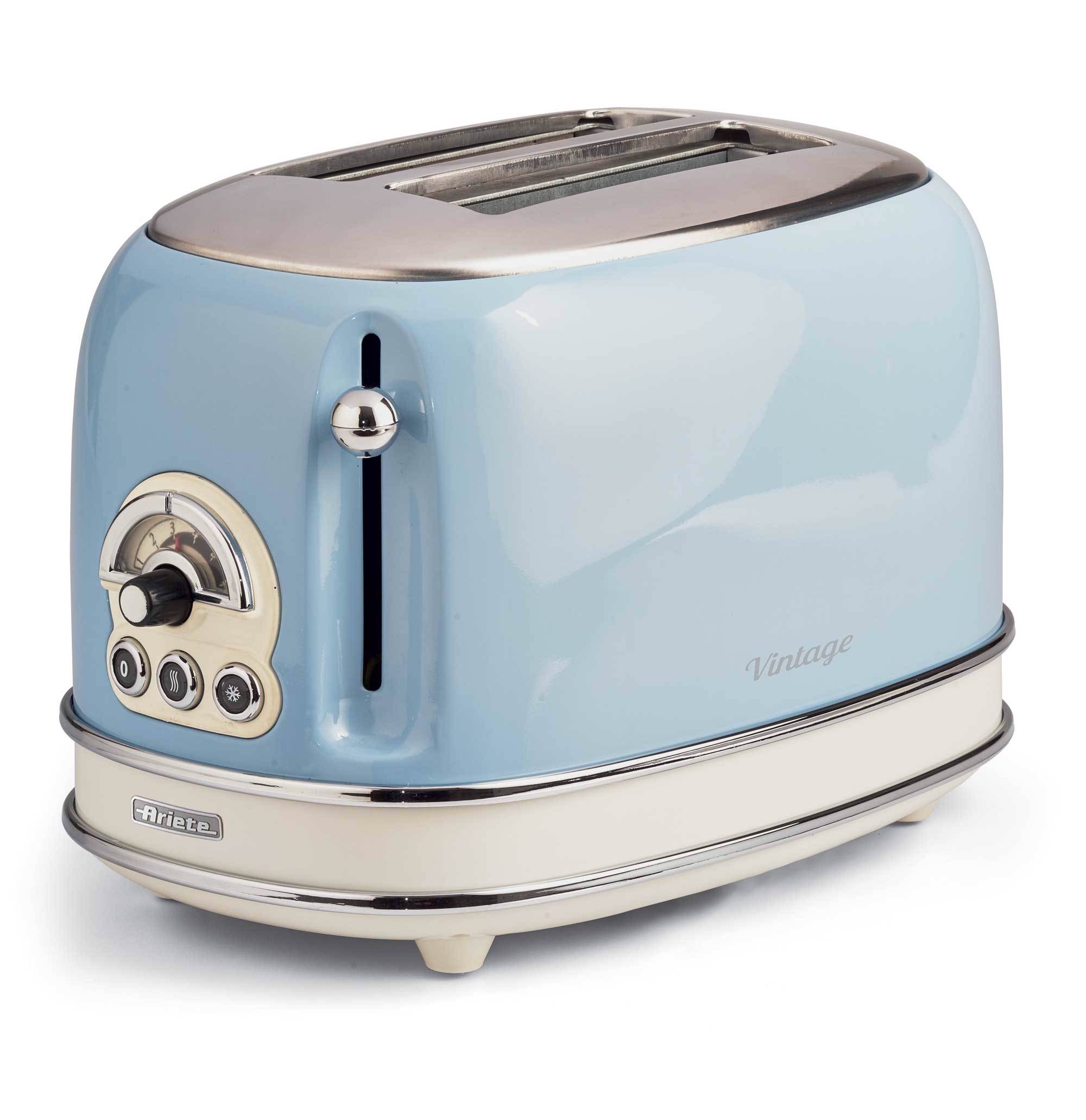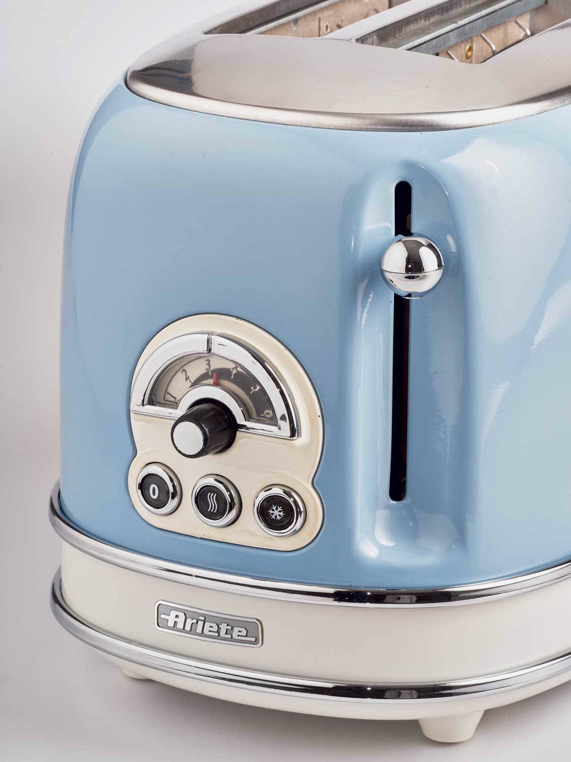 2-slice vintage toaster without pliers to toast simple slices or filled sandwiches, with auto eject and removable crumb tray, 6 levels of browning, coole touch sides and defrosting, heating and cooking function.