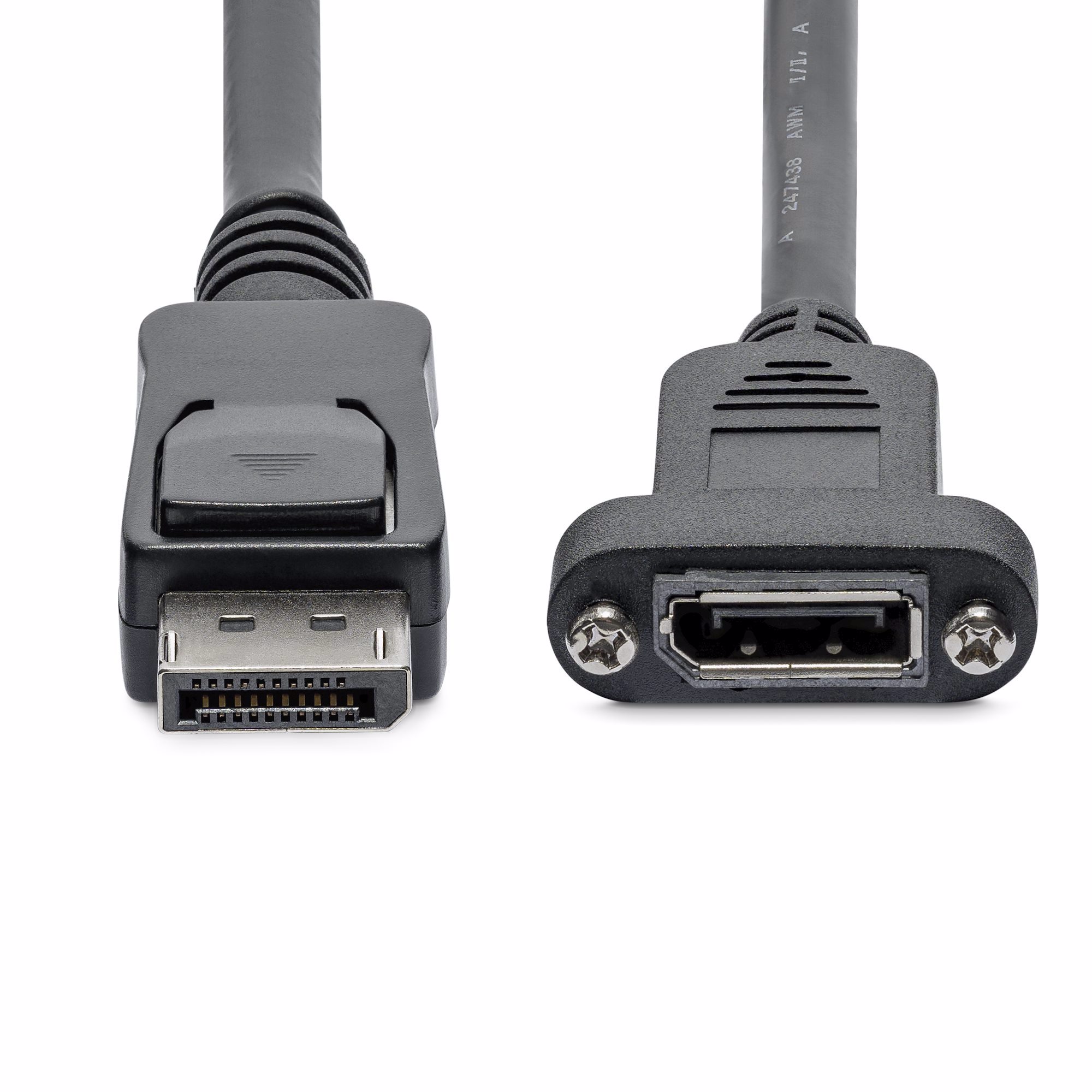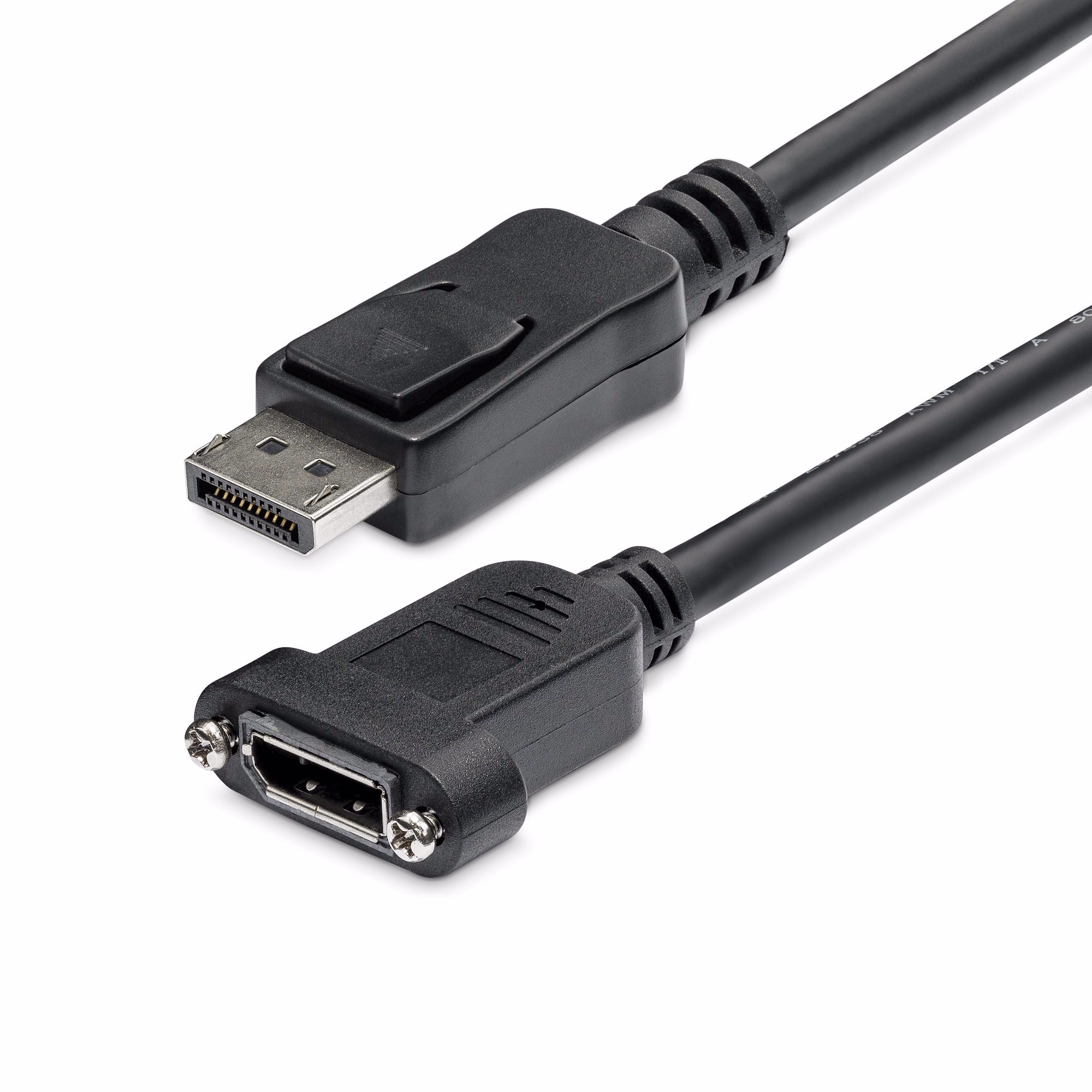 This 3ft panel mount DisplayPort cable features a DisplayPort male connector on one end, and a DisplayPort panel mount (female) molded connector on the other, providing a well-secured, easy to access DisplayPort connection on any machine port or faceplate.