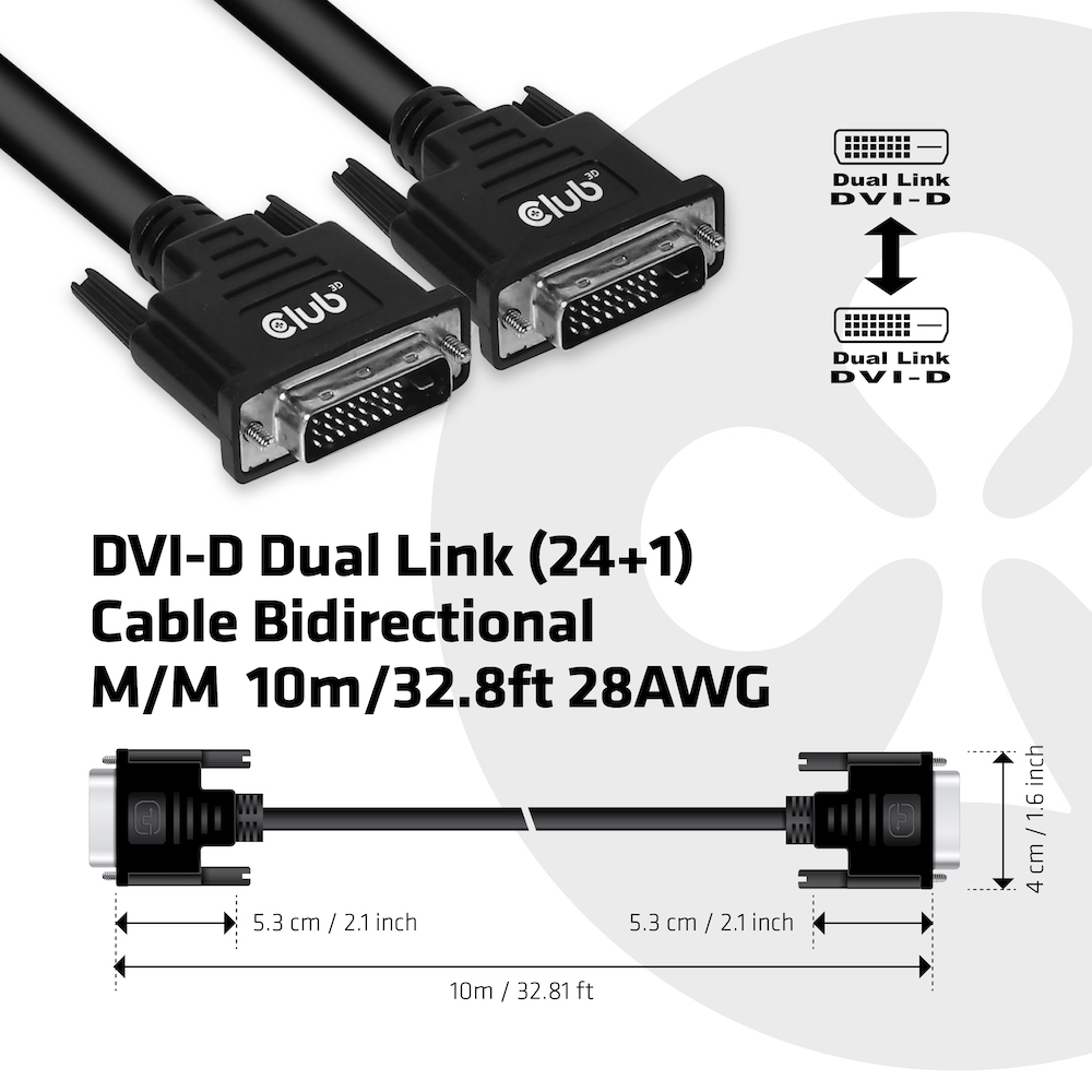 The Club 3D CAC-1220 is a DVI-D(24+1) Male to DVI-D(24+1) Male Cable. This cable is fully Bidirectional.This CAC-1220 Cable is the easiest solution for connecting your DVI-D Monitor, Projector or Television to the DVI-D output of your PC / Note- book / Game Console.