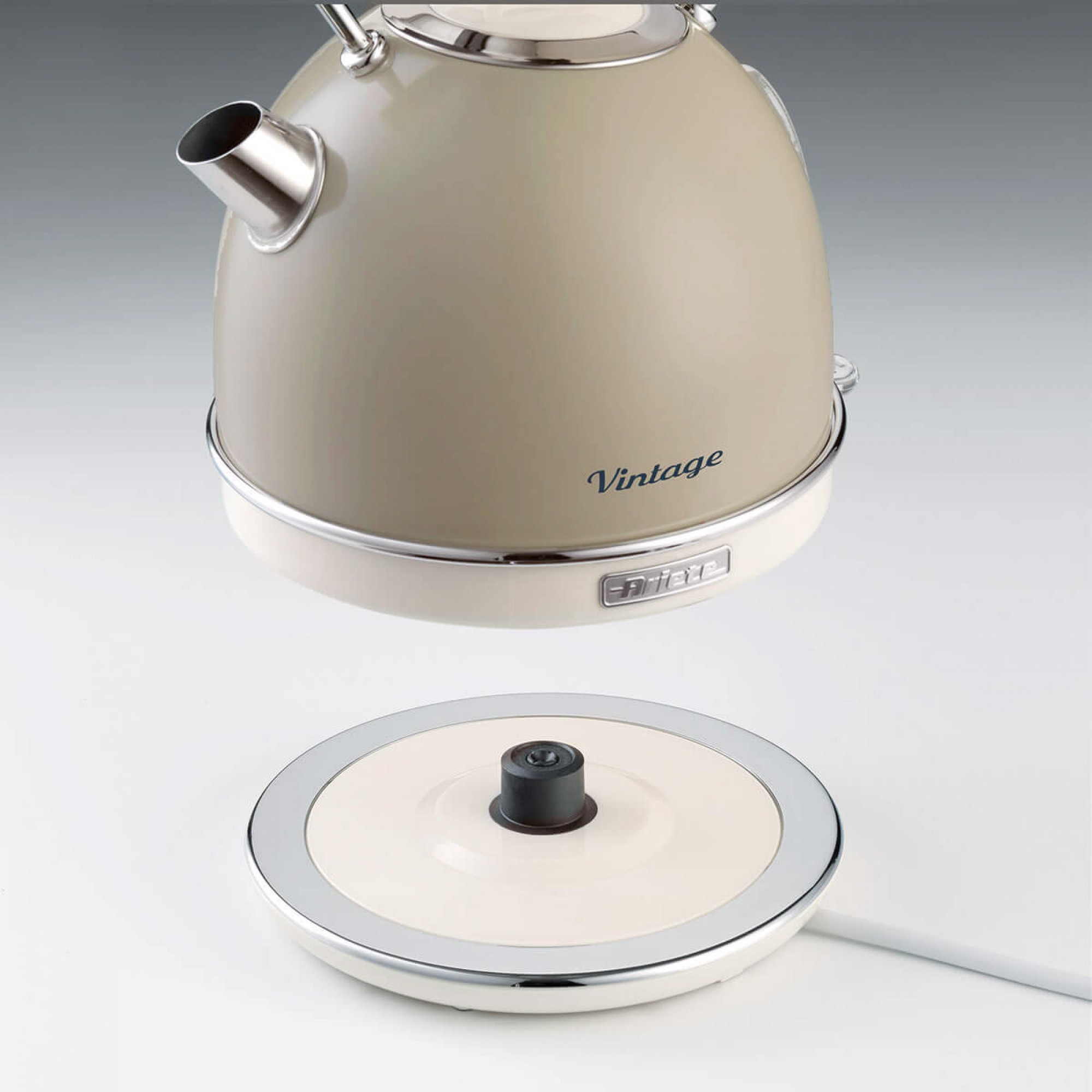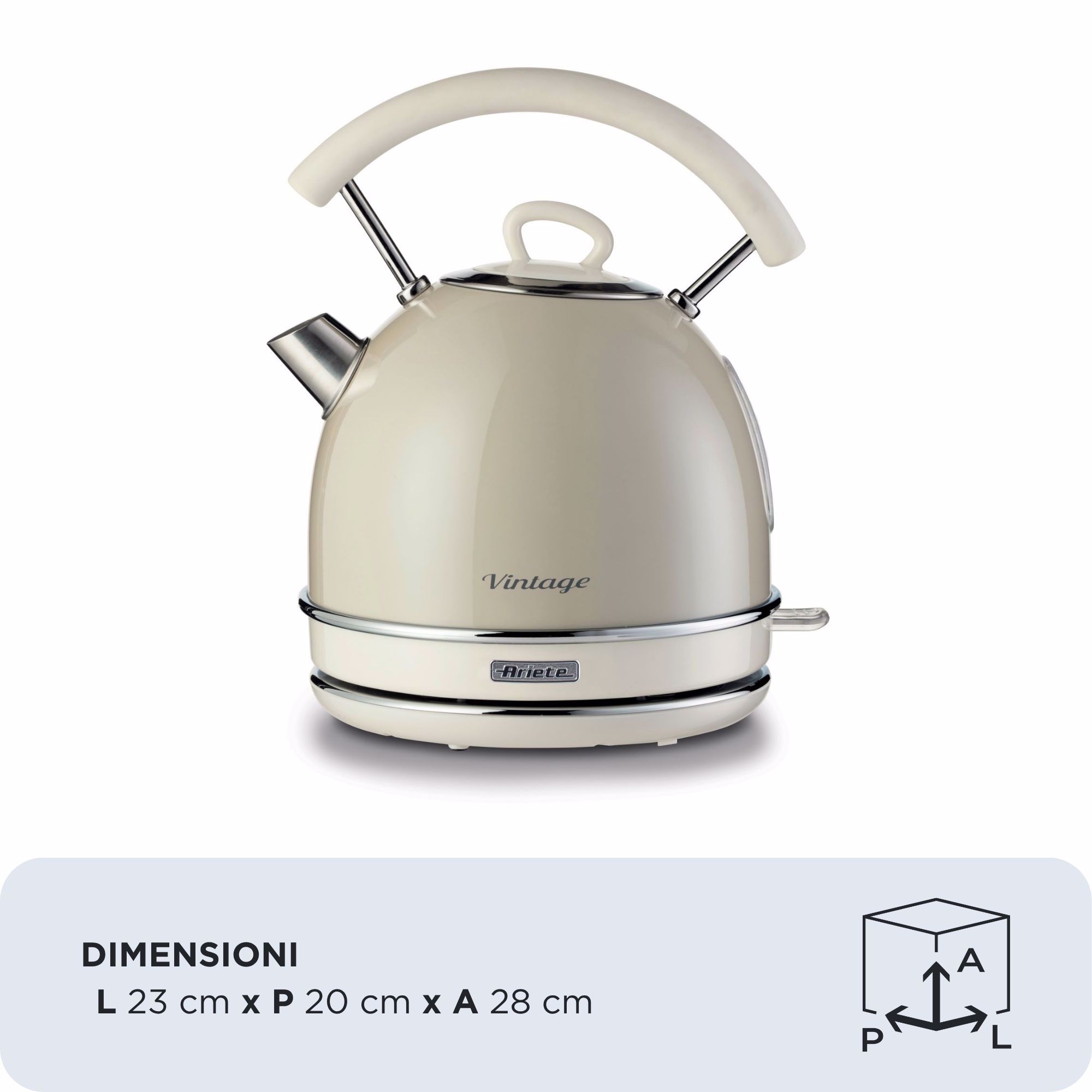 Kettle with a vintage design that recalls old-fashioned shapes, essential to taste moments like breakfast or tea break at their best. Equipped with removable and washable scale filter, an ergonomic handle with soft touch finishing and auto-off system, it's an essential ally in every kitchen.