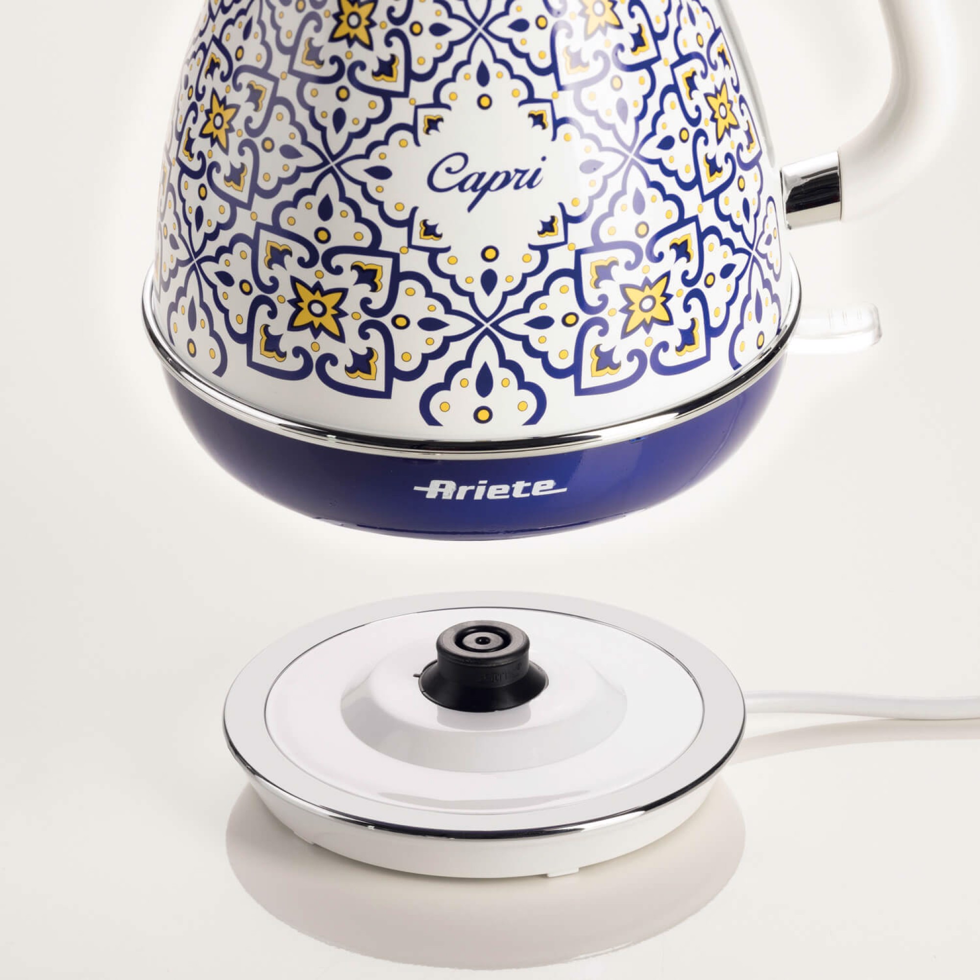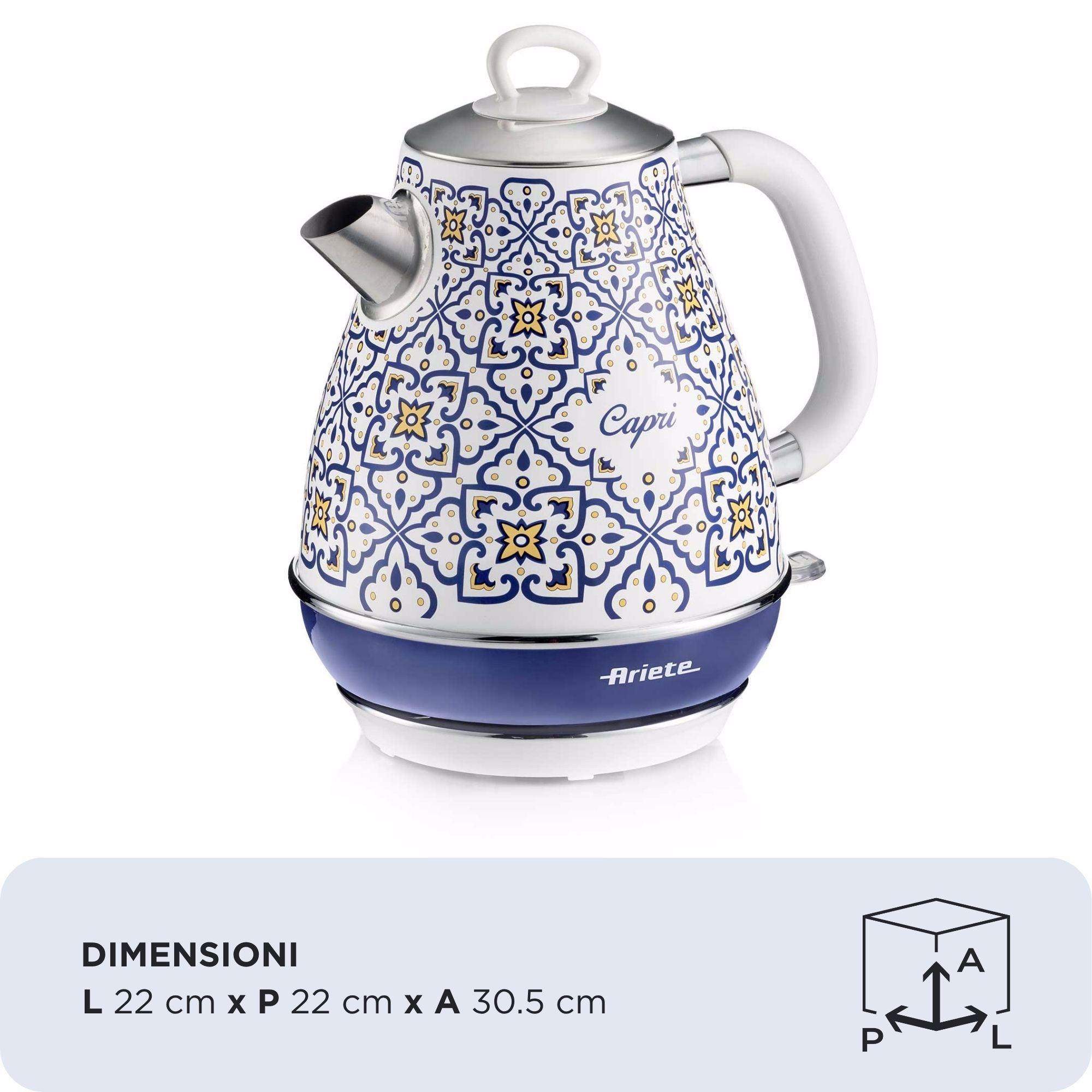 Refined design and cutting-edge functionality to transform your kitchen into an oasis of beauty, the Mediterranean charm of this line is inspired by the unique and vibrant style of the beautiful island of Capri.The Capri electric kettle has sinuous and elegant lines that evoke the Mediterranean art and culture, with a cordless base and a 1.7-litre capacity, to make breakfast or an afternoon break even more intense. The Capri electric kettle is a true ally for tea, herbal teas and hot drinks lovers.
