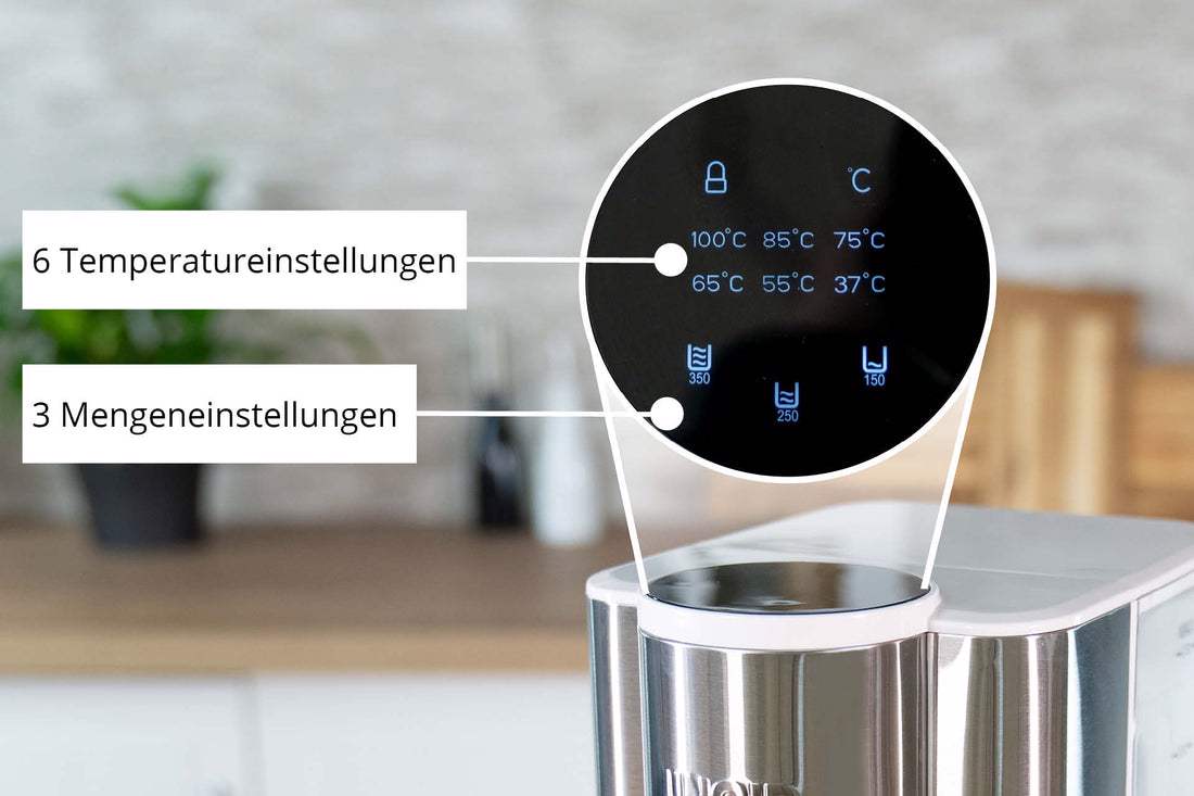 With the powerful stainless steel hot water dispenser, you can prepare perfectly tempered water for tea, coffee, instant meals, etc. in just 5 seconds. Choose between 6 different temperature settings (100 °C, 85 °C, 75 °C, 65 °C, 55 °C and 37 °C). Thanks to the practical 37 °C direct selection button, Ava is also ideal for preparing baby food. You also save energy automatically - the amount of water can be precisely dosed and quickly brought to the right temperature, so that hot water preparation is up to 50% more energy efficient than with a conventional kettle.