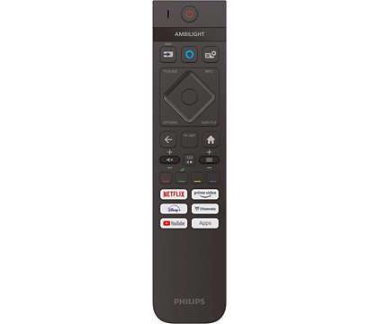This TV has polished metal feet, and you can use Ambilight as instant mood lighting when the screen is off. The TV remote is made from recycled plastic, our packaging uses FSC-certified recycled cardboard and the inserts are printed on recycled paper.