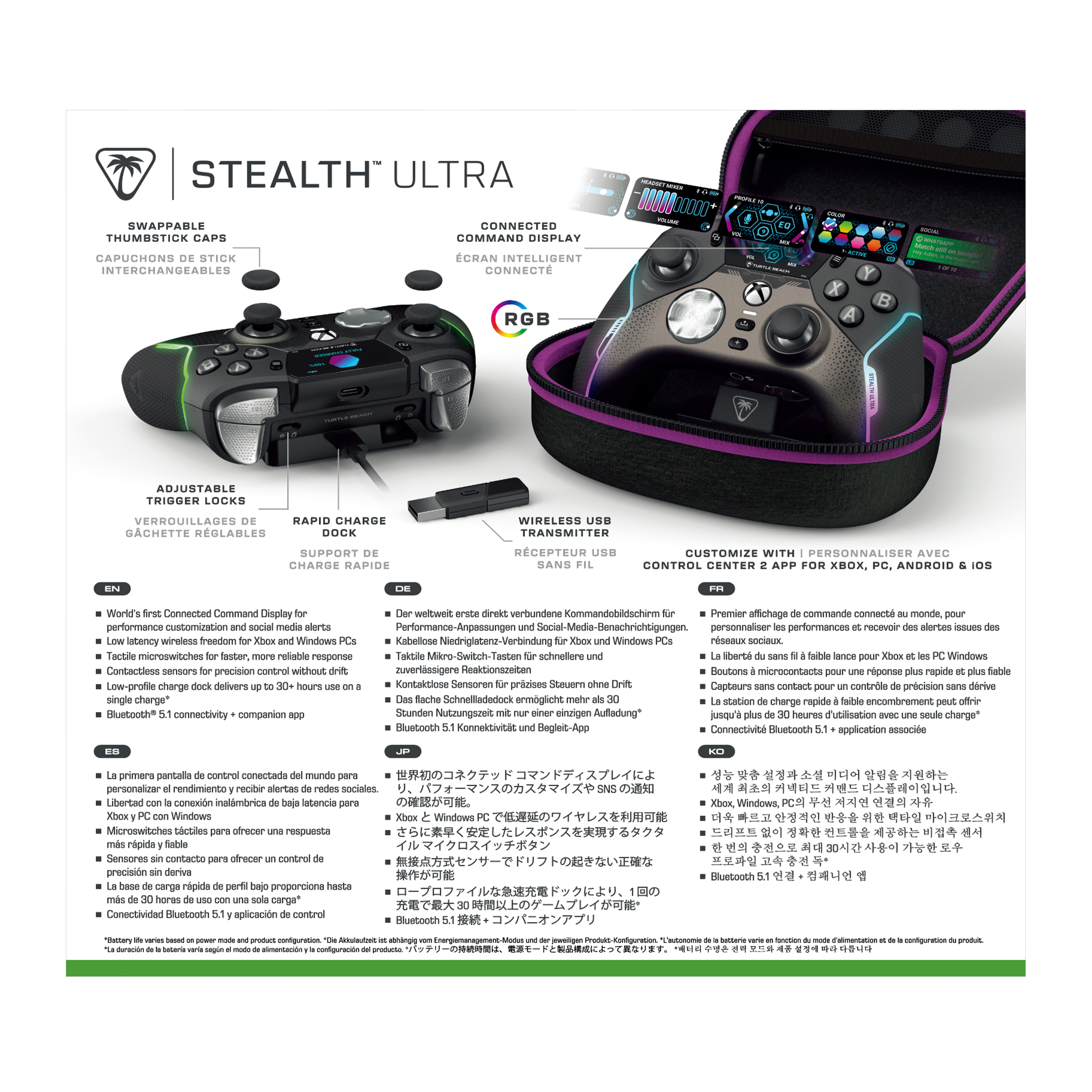 The Turtle Beach® Stealth™ Ultra high-performance wireless smart game controller with charge dock is built for gamers who demand the best. Lag-free wireless quickly connects to Xbox consoles, and Windows PCs, plus Bluetooth® for Android devices & supported Smart TVs. Tactile microswitches throughout provide fast, reliable response and last up to 5X longer than standard buttons, while AntiDrift™ thumbsticks eliminate drift for precise, customizable control and adjustable triggers suit your game on the fly. The Connected Command Display lets you customize the RGB lighting, audio, thumbsticks, mappable buttons and more, plus patented technology receives social notifications from your phone. Best of all, adjustable power modes provide up to 30 hours of battery life on a single charge.