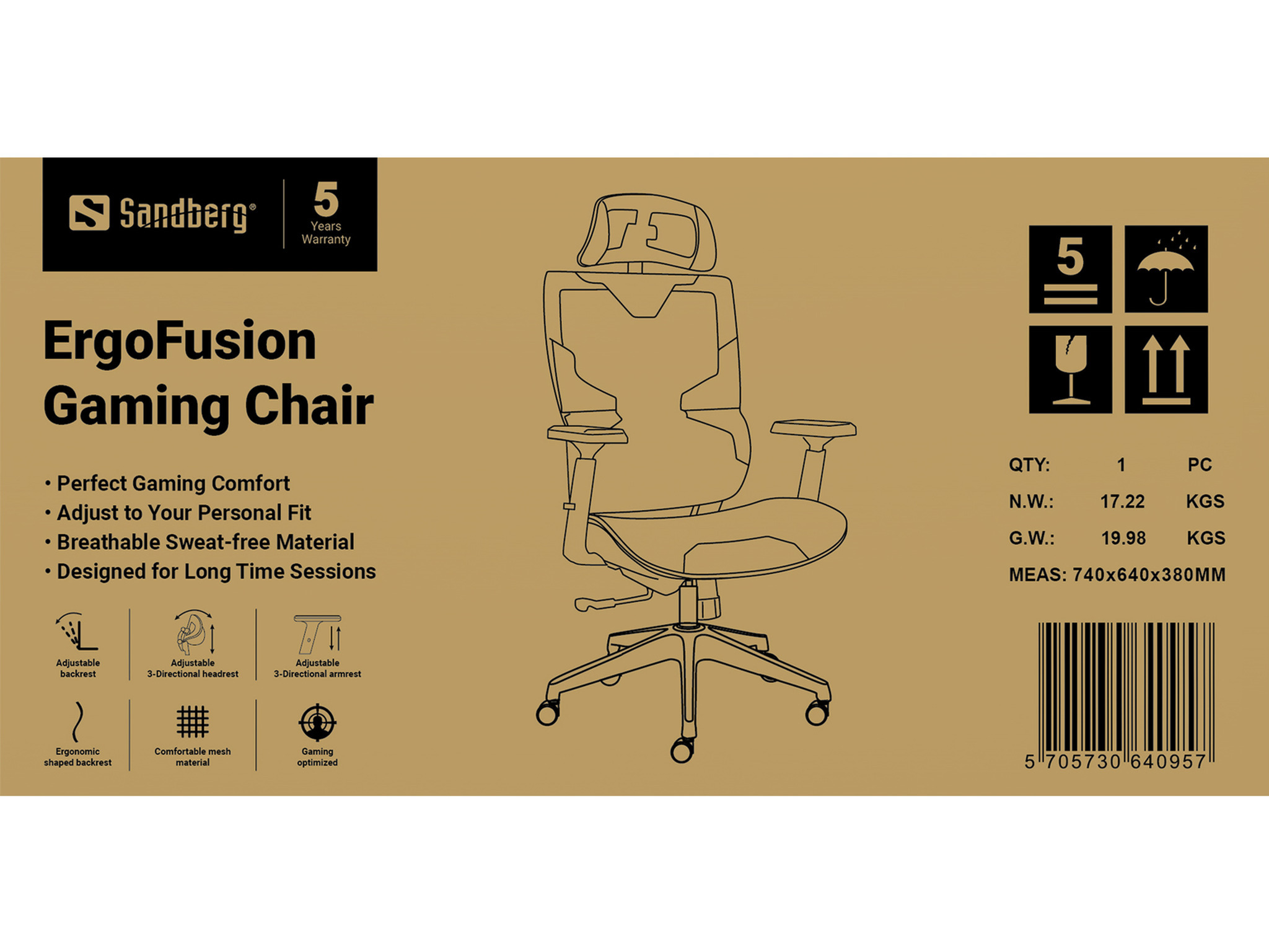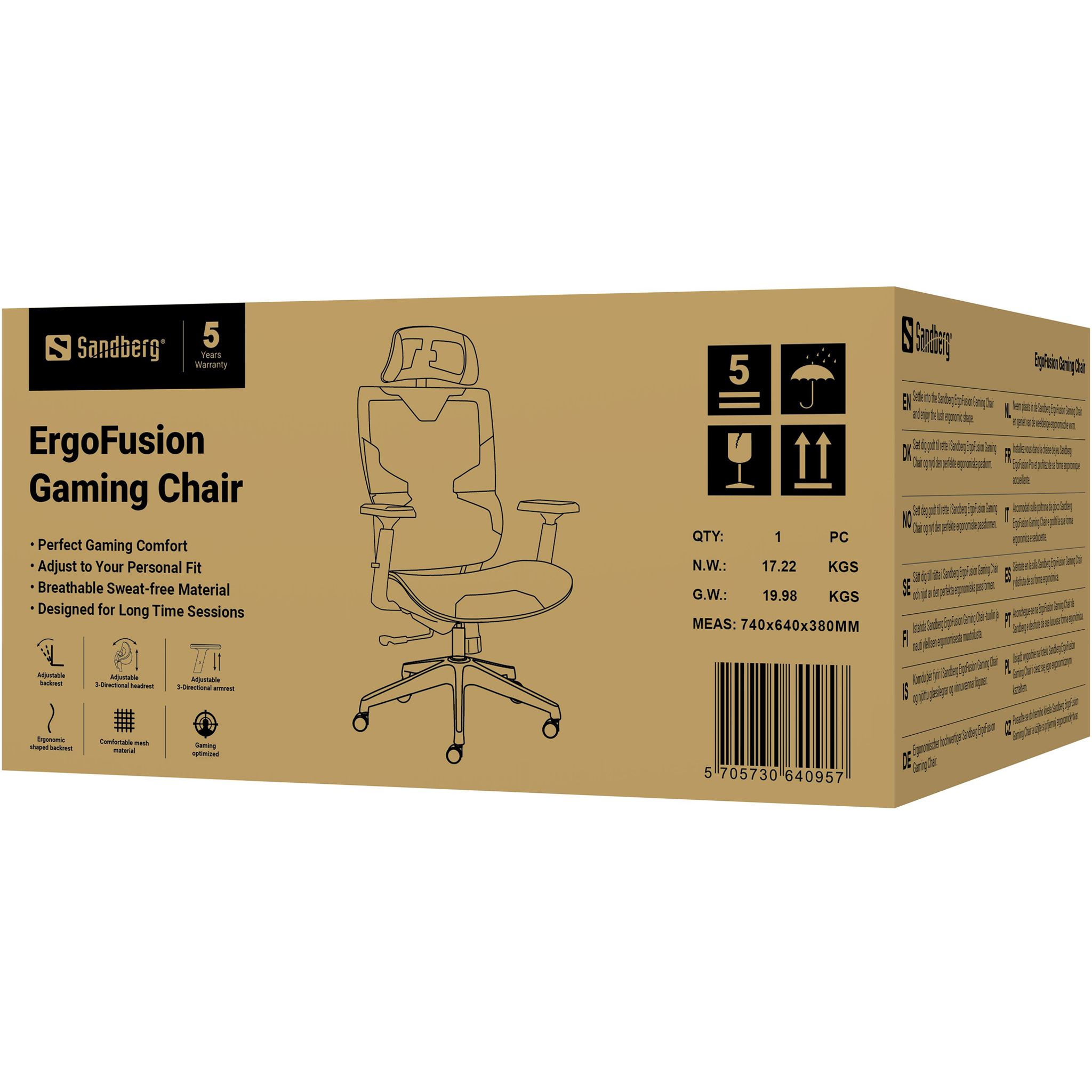 Sæt dig godt til rette i Sandberg ErgoFusion Gaming Chair og nyd den perfekte ergonomiske pasform. Du kan sidde behageligt i mange timer, både når du gamer og laver kontorarbejde. Du får optimal komfort ved hjælp af de mange indstillingsmuligheder, der kan tilpasse stolen præcis til dig. Sæde og armlæn kan justeres individuelt i højden, ryglænet kan justeres i hældning og låses i 4 positioner. Nakkestøtten kan justeres både i højden og 2 vinkelled. Ryglæn og sæde er udført i åndbart mesh og PU materiale. Stolen er konstrueret i solide kvalitetsmaterialer som bare holder, hvilket er understreget af hele 5 års garanti på stolen.