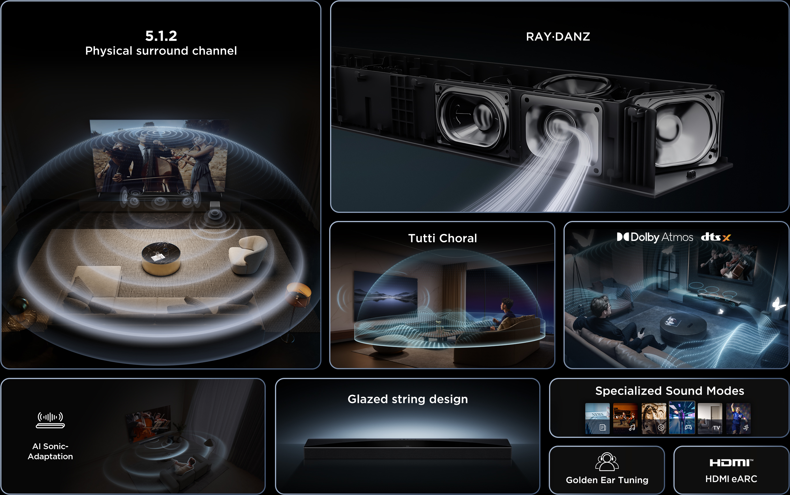 Dolby Atmos og DTS:X fanger realistisk bevægelsen af hvert objekt og leverer 360° surroundlyd. Løft din oplevelse til 5.1.2-kanaler og 11 højttalere, der afslører dybde, klarhed og detaljer som aldrig før.