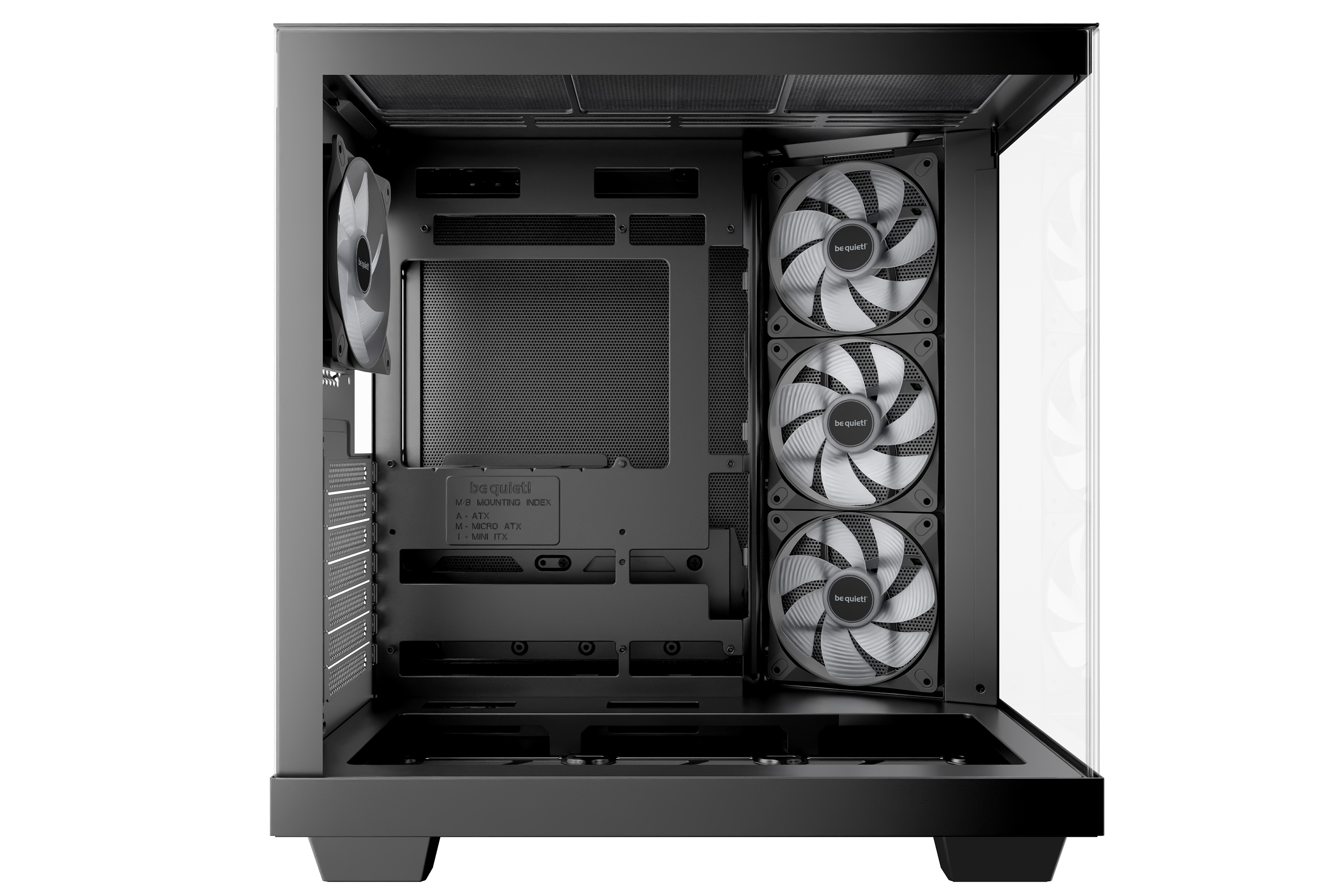 Light Base 500 LX Black features 4 preinstalled Light Wings LX fans. The rear fan is a Light Wings LX 120mm, the fans on the side are Light Wings LX 120mm PWM fans with reversed fan blades. All fans feature 16 LEDs inside their hub of the impeller, making for an unmistakable ARGB illumination. The reversed fan blades make sure that their pretty side is visible at all times.
