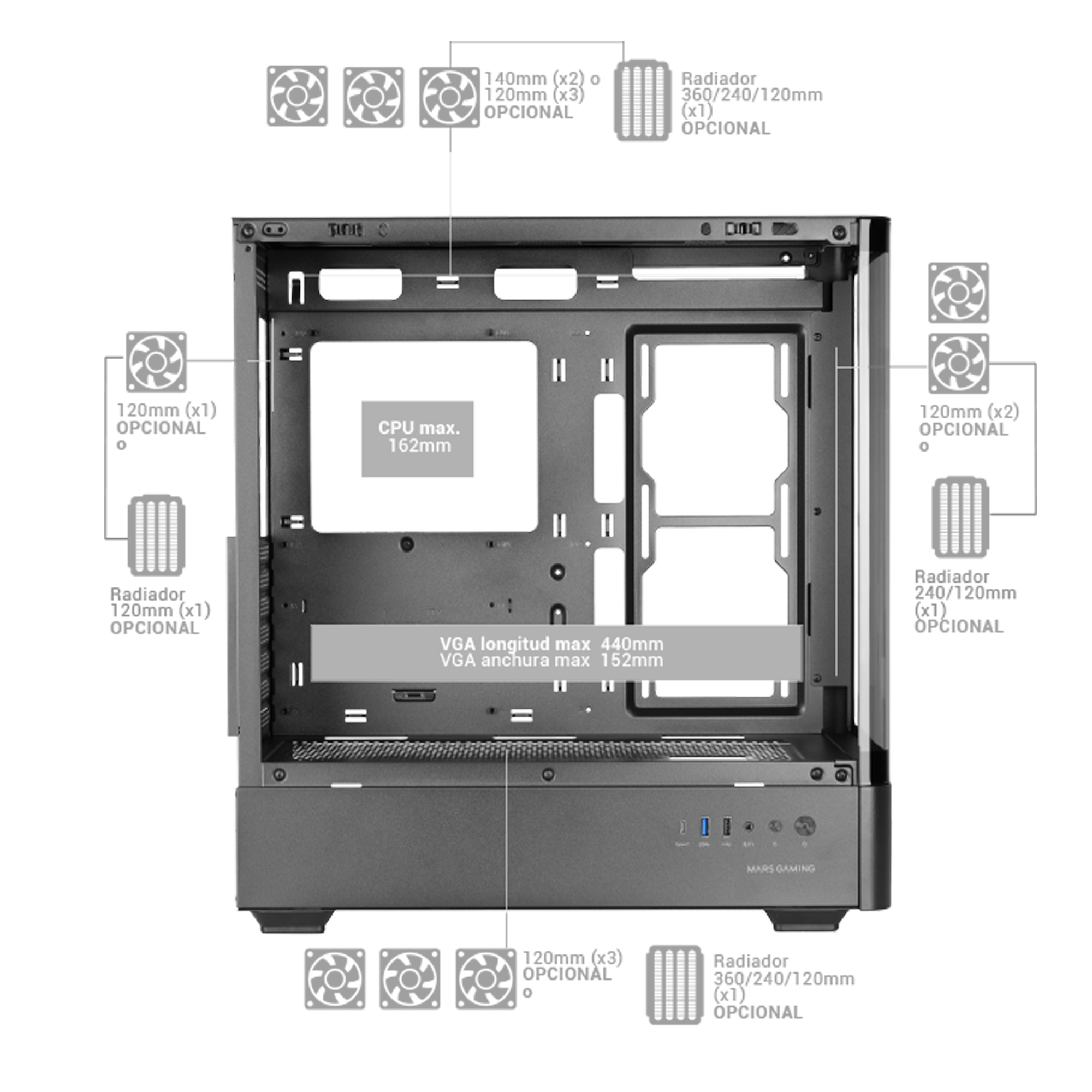 | Understøttede diametre for bagerste ventilatorer | 120 mm |