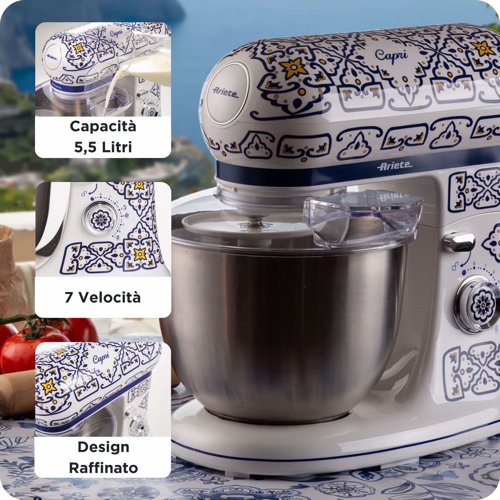Tilbehør inkluderet gancio impasto duro, frusta per montare, coperchio paraschizzi
