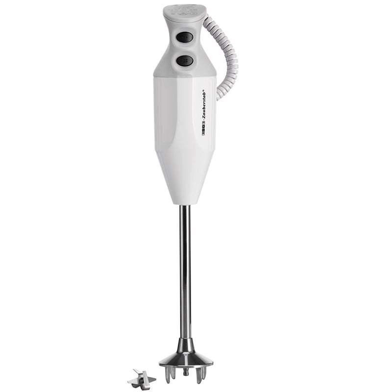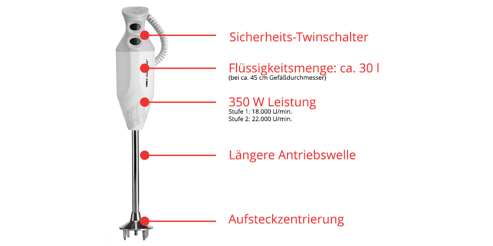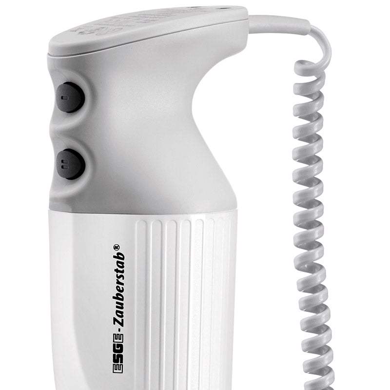 The ESGE-Zauberstab® P 350 Profi is made for the catering industry! Its long-lasting, robust AC motor "Made in Switzerland" offers 350 watts of power to process up to 30 liters of liquid (with a container diameter of approx. 45 cm). Thanks to the safety twin switch with 18,000 or 22,000 revolutions per minute! Its multi-blade ensures top results because it whisks, chops, stirs, purees, strains and mixes. It is also very easy to attach thanks to the plug-on centering. The spiral cable, which can be extended up to 150 centimeters, ensures freedom of movement.