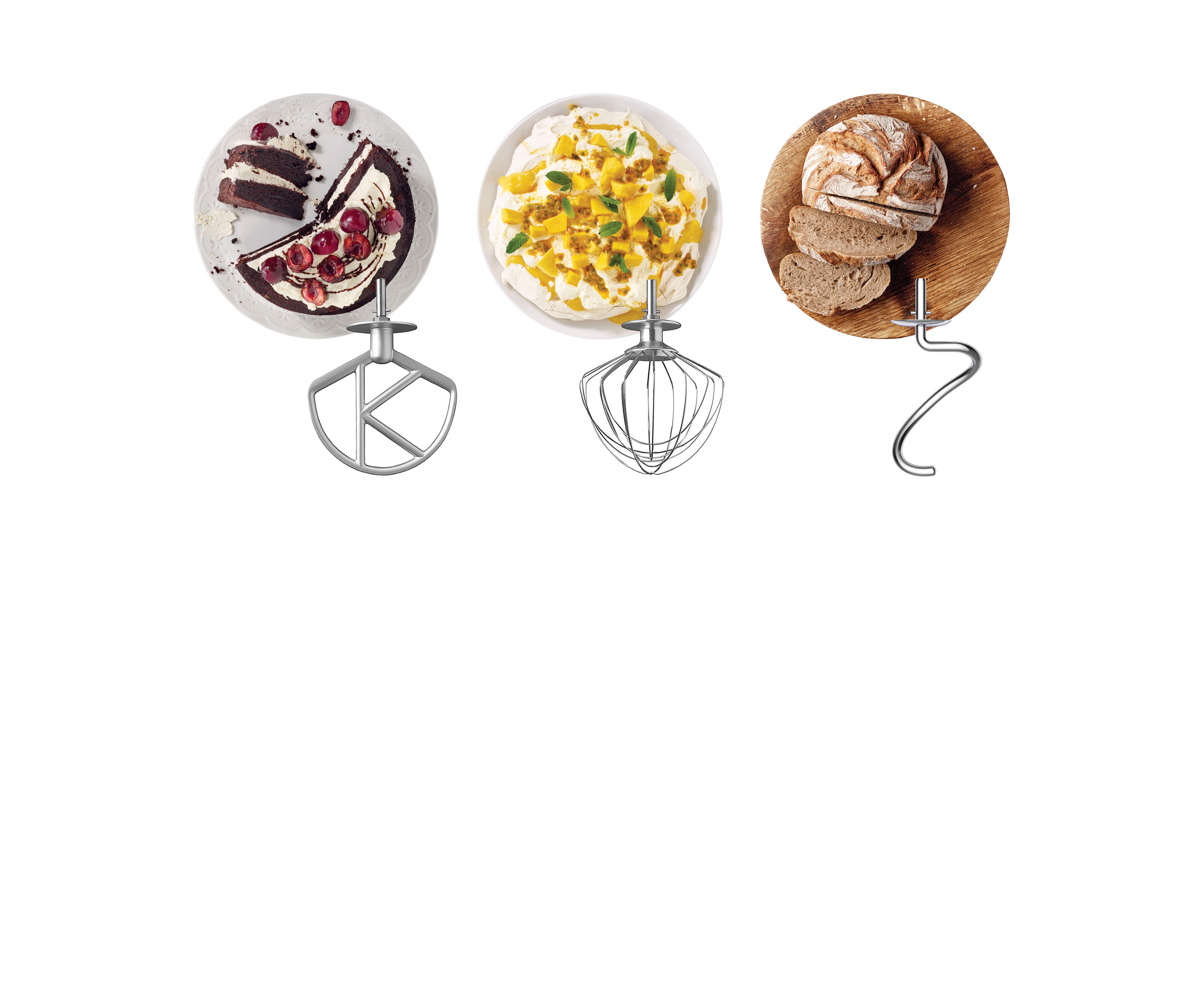 The accompanying bowl tools, K-Beater, whisk and dough hook, allow you to create flavoured breads, stylish cakes and enticing Pavlovas with ease.