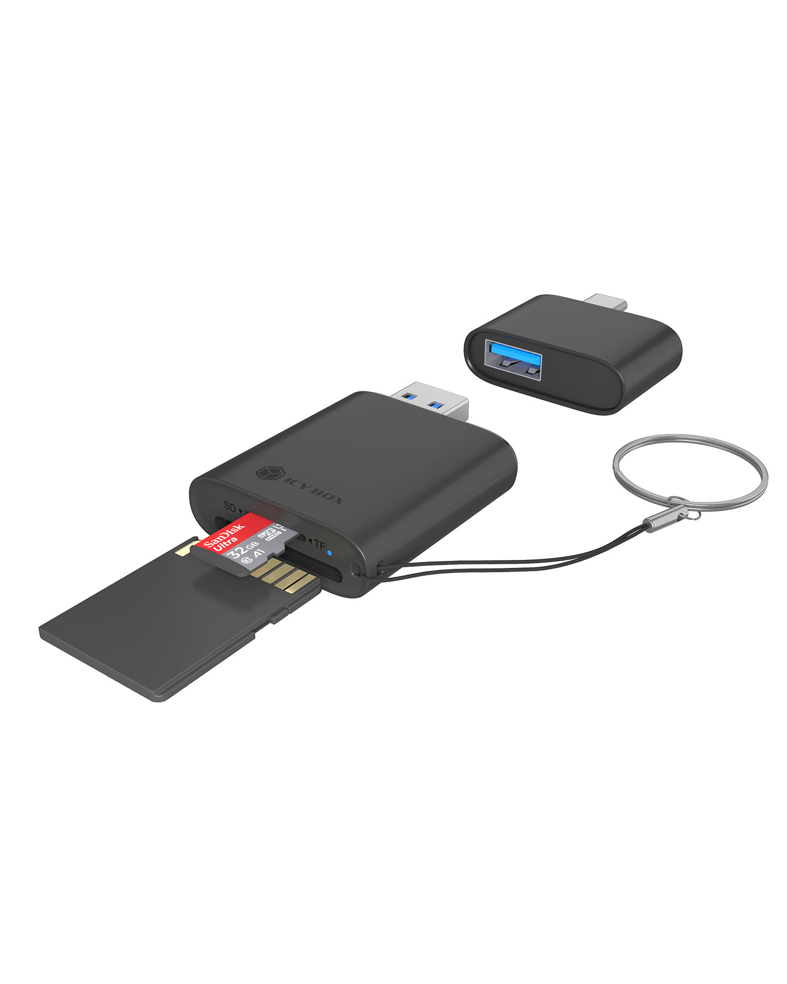 This card reader combines two widely used interfaces: an integrated Type-A connector and an additional Type-C® adapter. It allows users to switch between older computers and the latest USB Type-C® devices. Whether you are switching between devices at home or on the go, this feature guarantees functionality and ease of use.