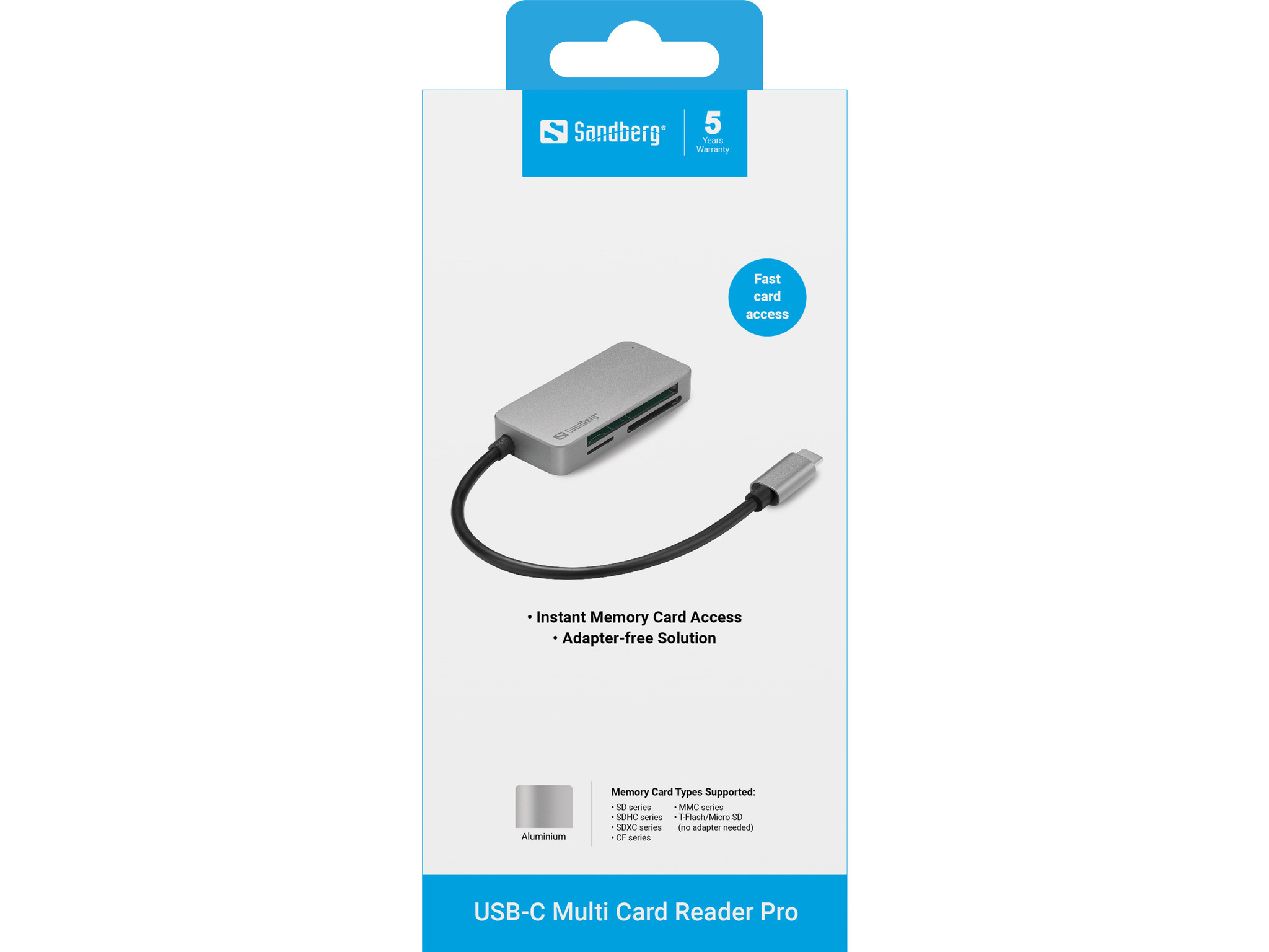 Sandberg USB C Multi Card Reader Pro giver dig nem adgang til data på en lang række hukommelseskortformater via USB C. Den er ideel til både overførsel og backup af billeder, videoer og filer – hvad enten du arbejder professionelt med kameraudstyr eller bare vil tømme kortet fra din drone. Enheden fungerer som en ekstern harddisk: Tilslut, og du er i gang, helt uden behov for installation.