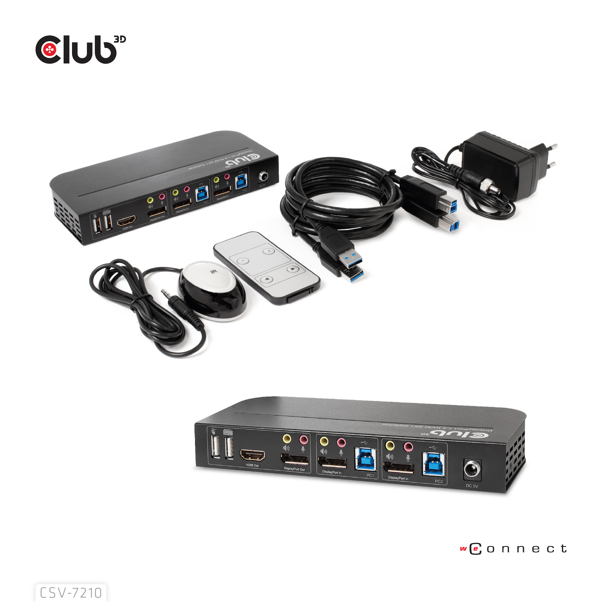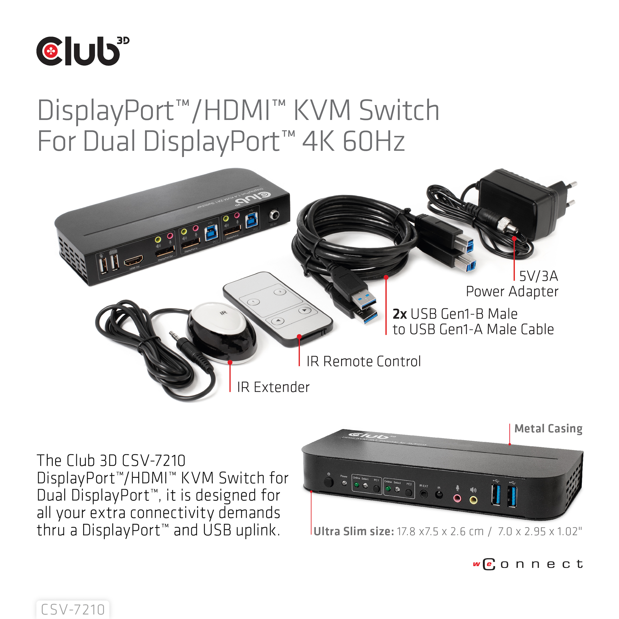 The CSV-7210 is a high performance DisplayPort™ KVM (Keyboard Video and Mouse) switcher. It routes high definition videos up to 4096x2160 at 60Hz resolution and audio from any DisplayPort™ source to any HDMI™ or DisplayPort™ supported display. This DisplayPort™ KVM switcher not only has the key press switching function, but also has an intelligent function as well as hot pluggable function.