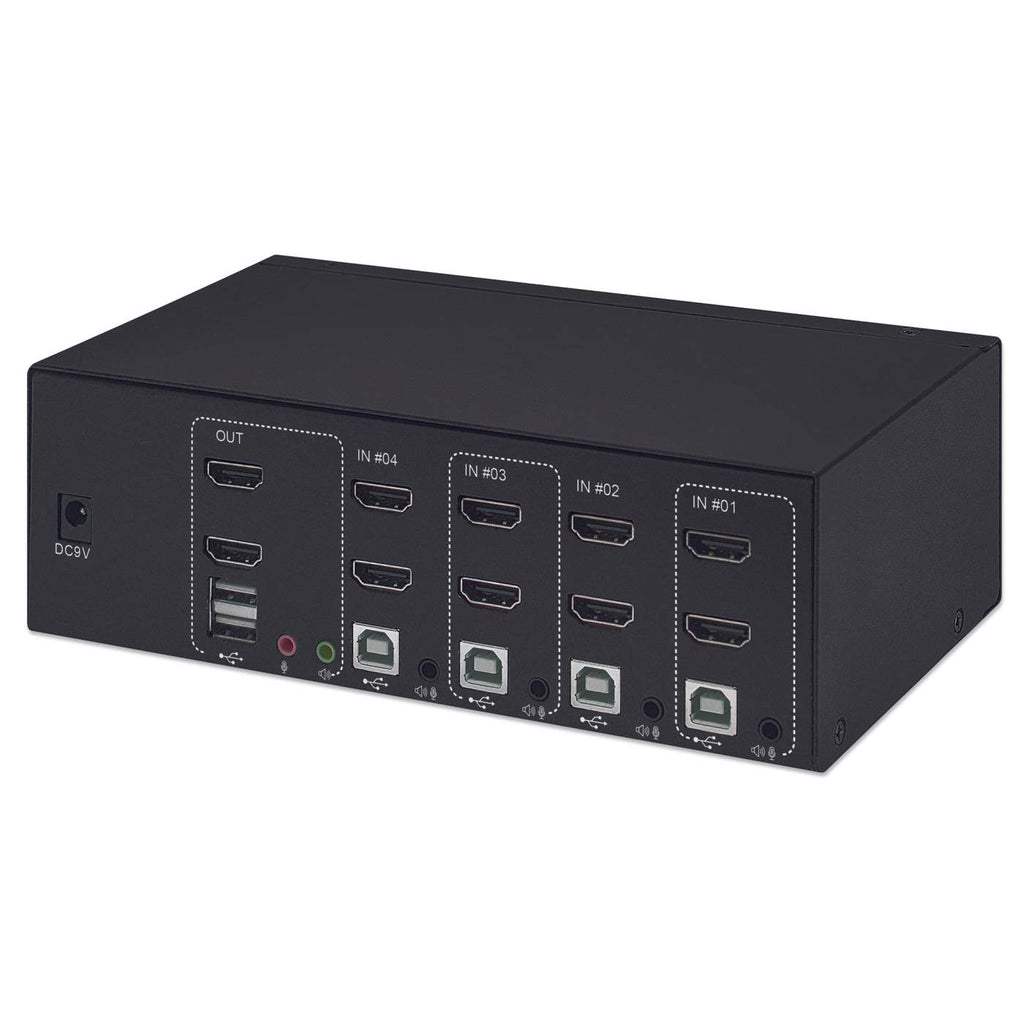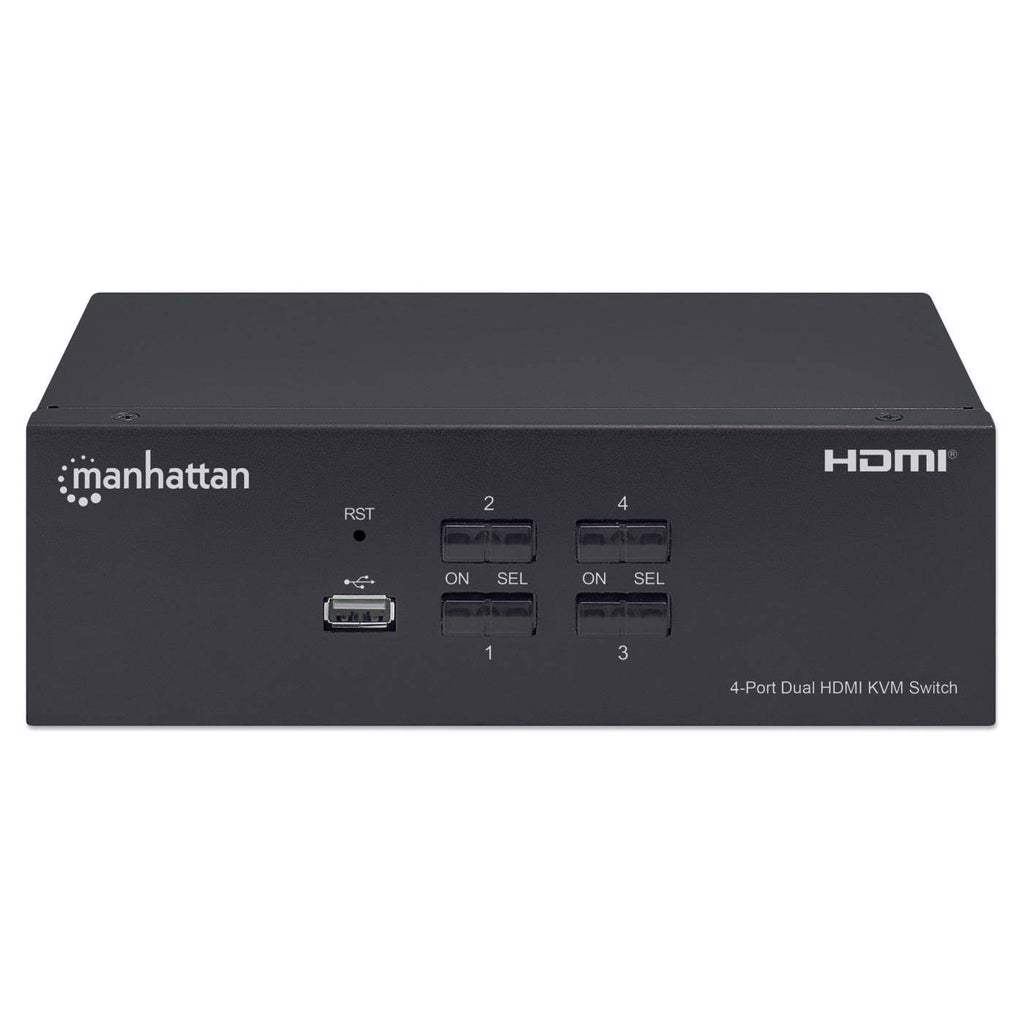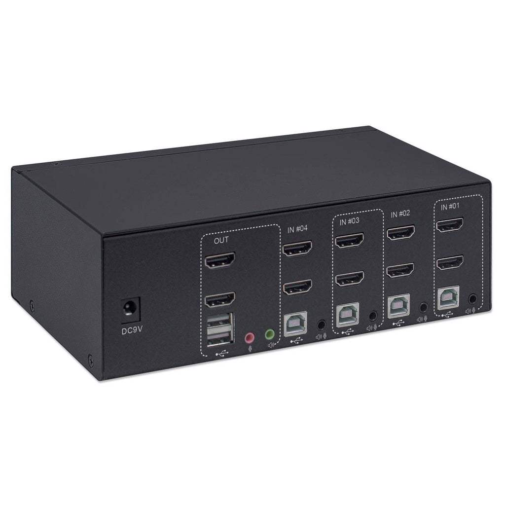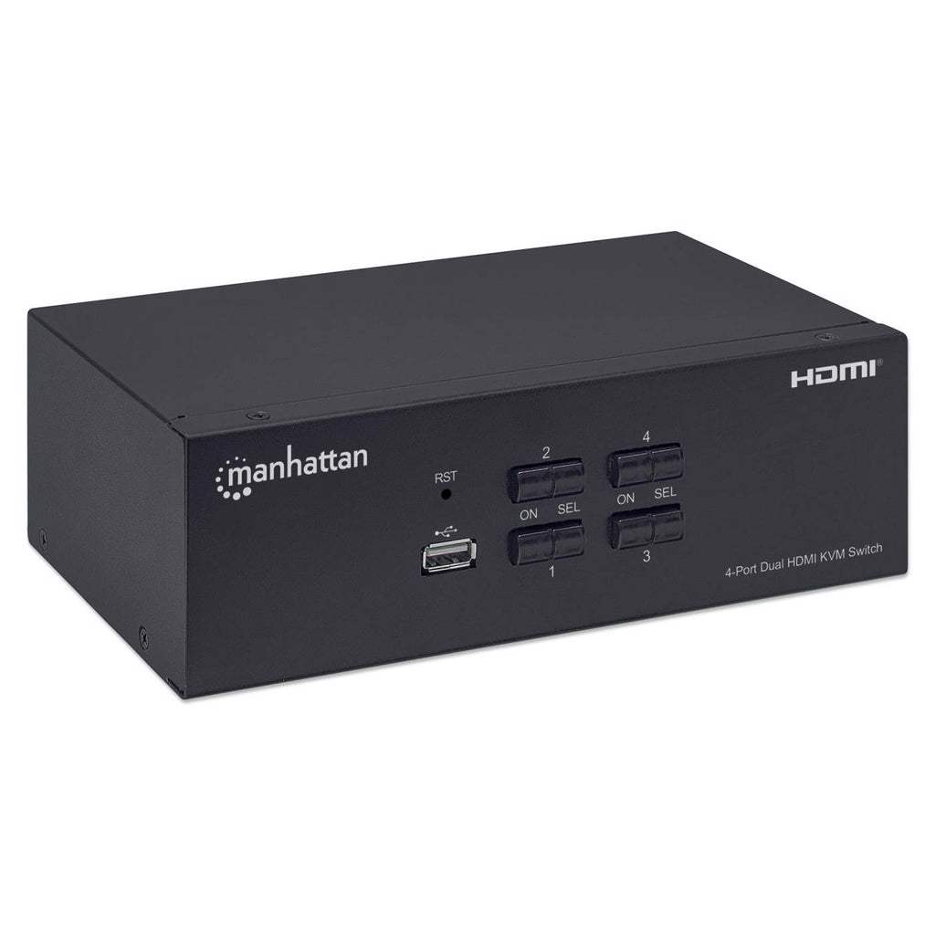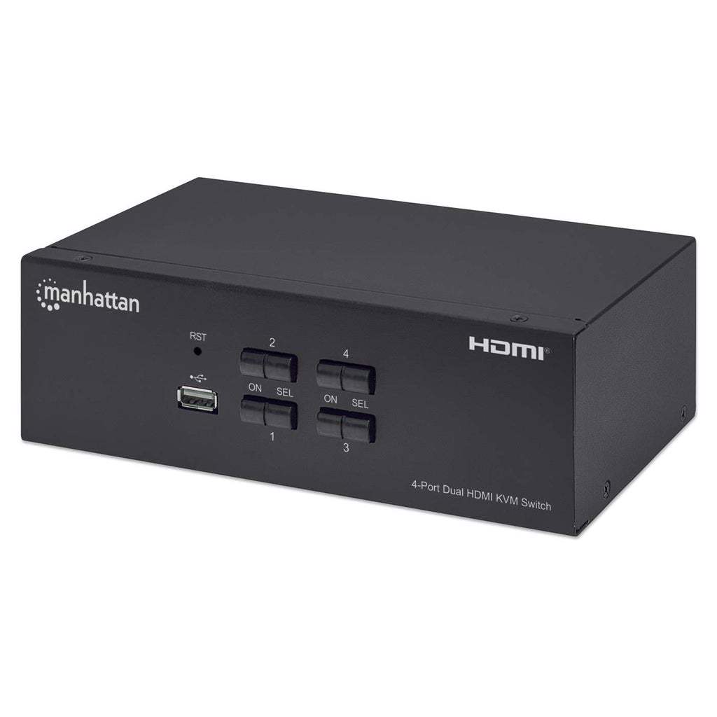 The Manhattan 4-Port Dual-Monitor HDMI KVM Switch is a compact solution for providing access and control over four HDMI/USB-equipped computers from a single keyboard and mouse and up to two monitors. It helps save you time on installation with its included combo cables — there's no need to purchase additional ones — that easily connect directly to the system.