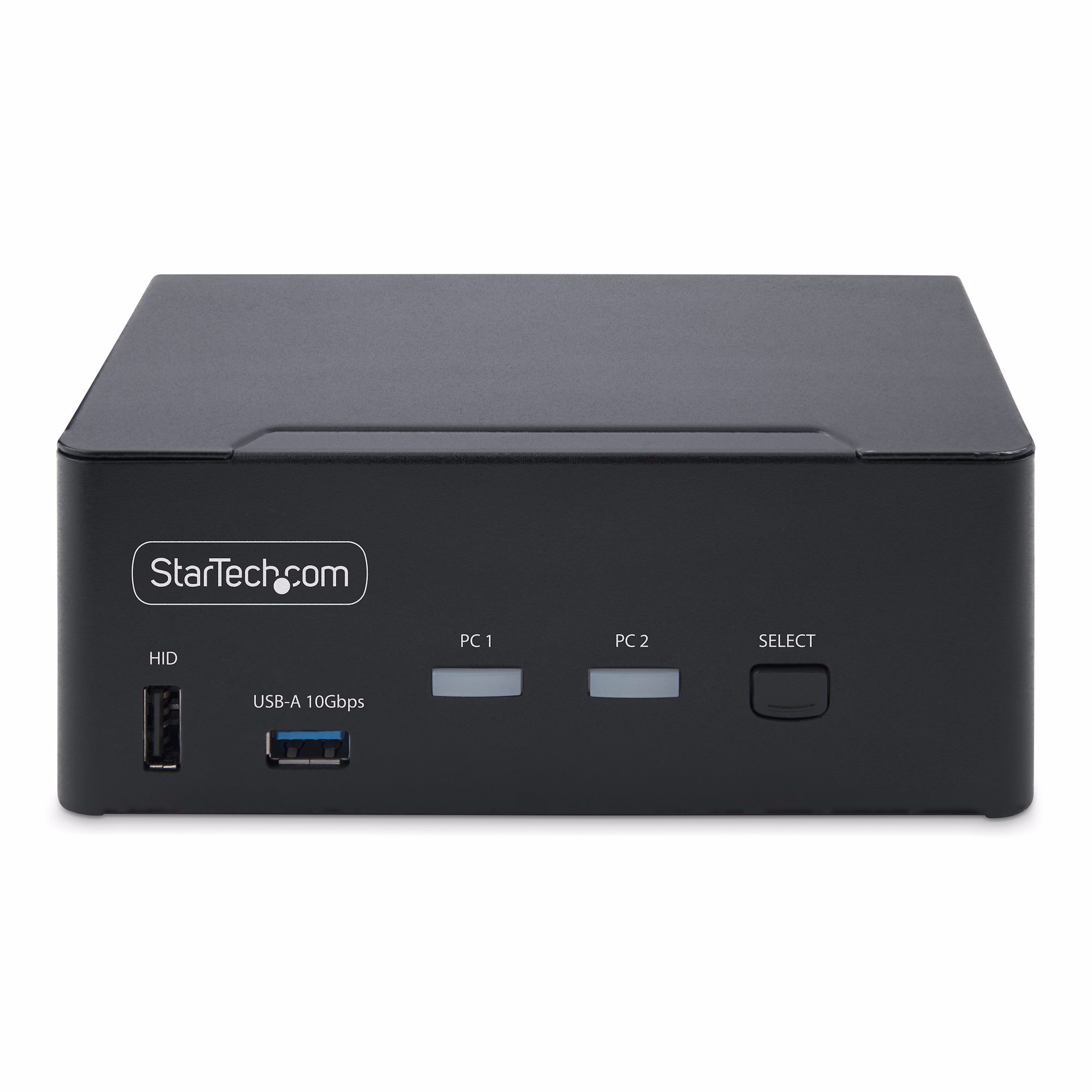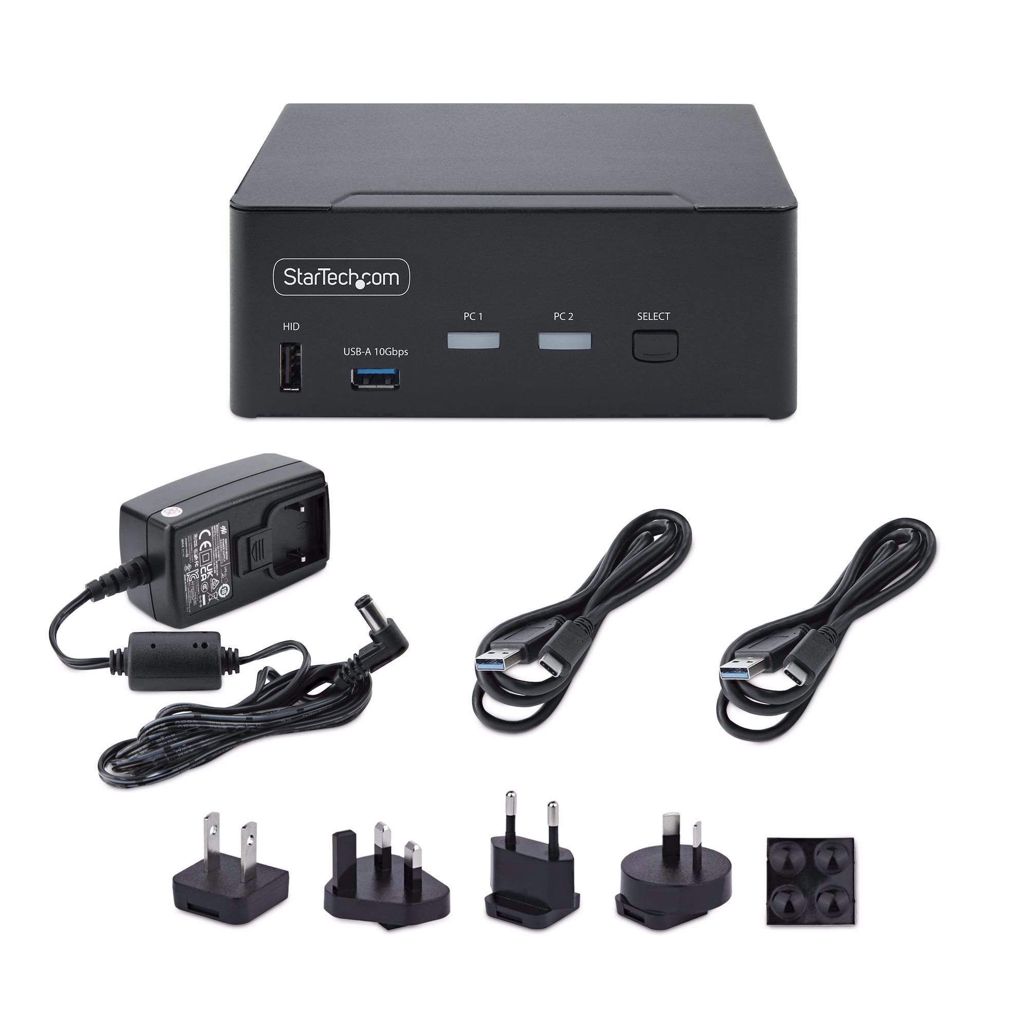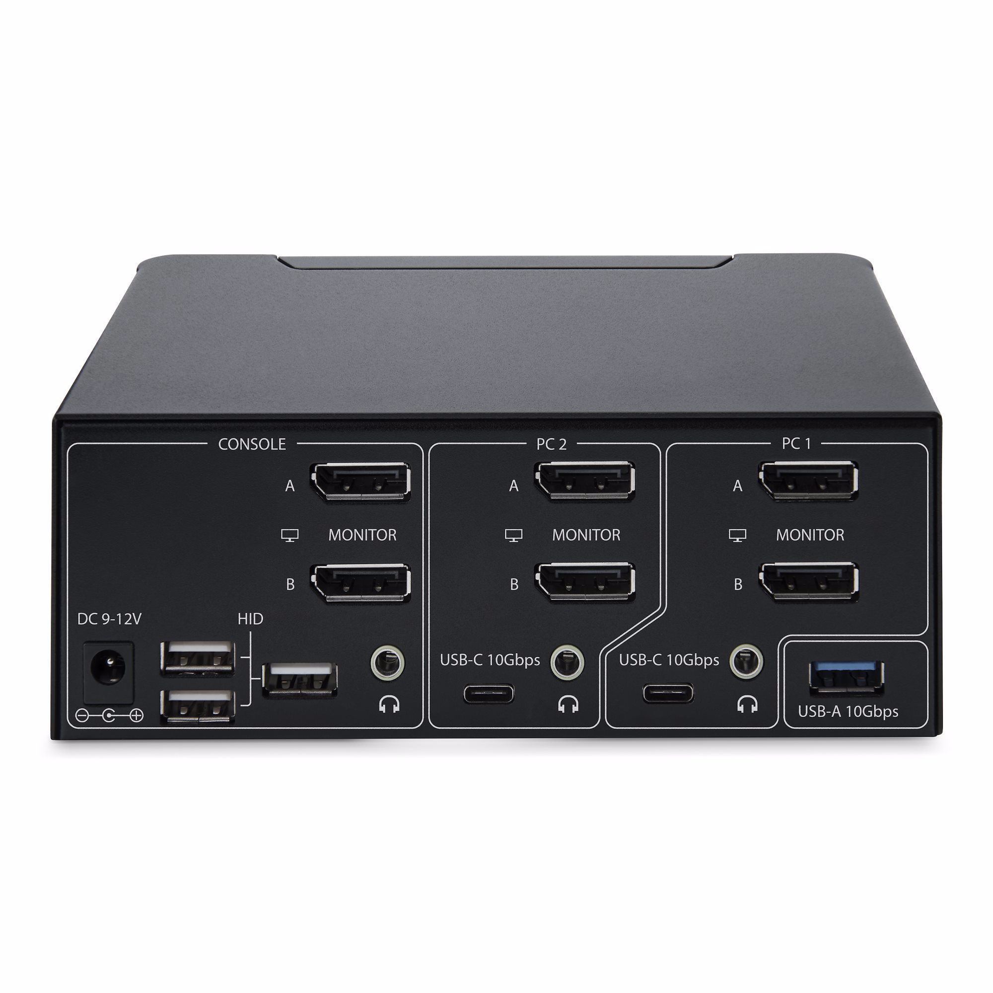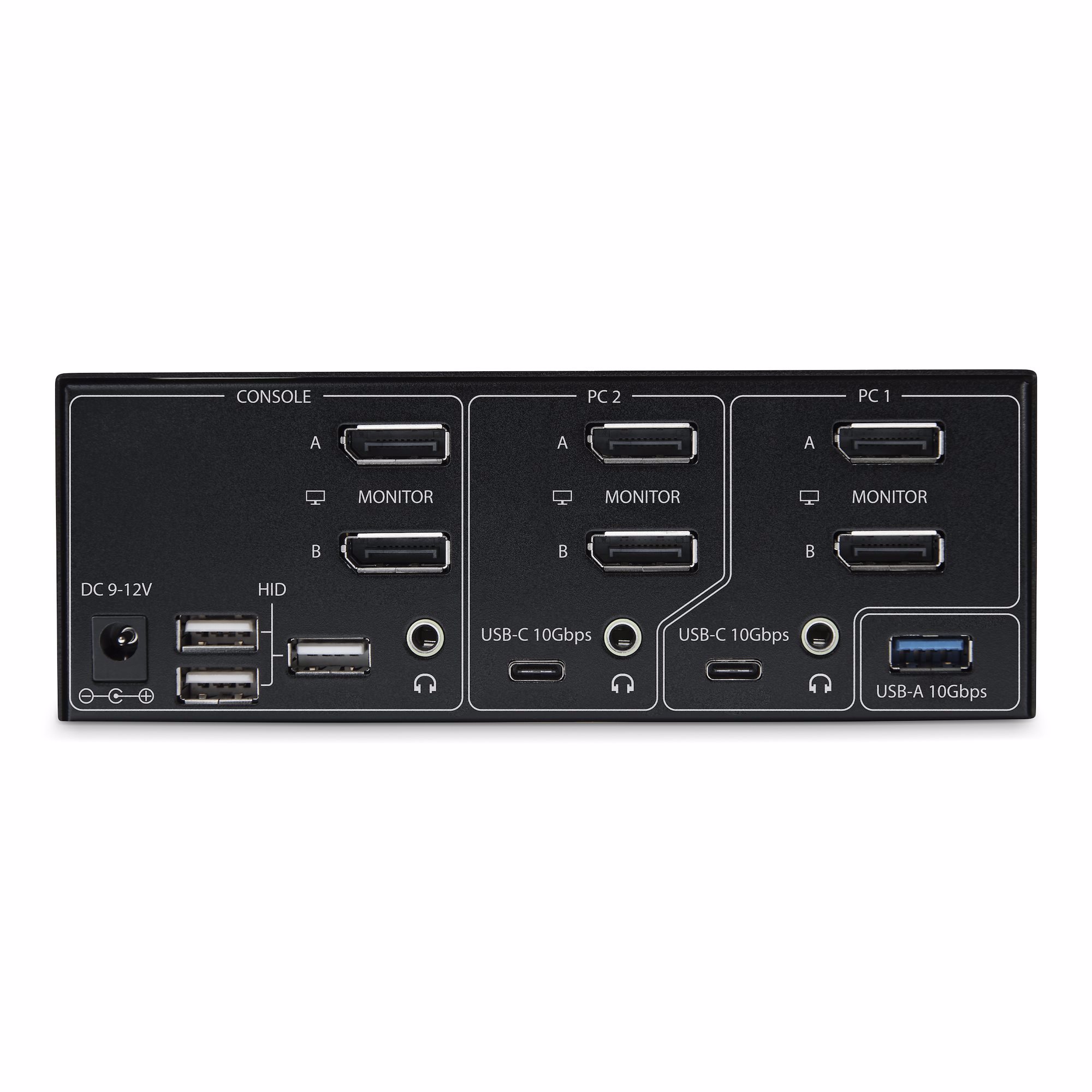 This dual-monitor KVM switch allows users to switch between two USB and DisplayPort-enabled desktops. It allows for sharing of dual-8K 60Hz DisplayPort monitors, a keyboard and mouse, and two USB 10Gbps devices.