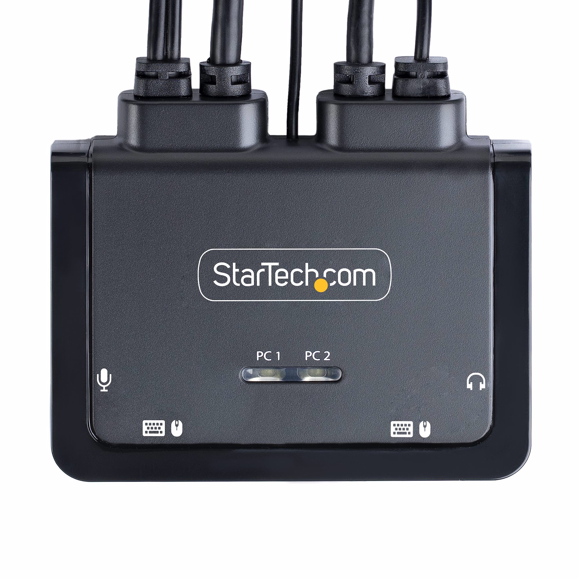 The 2-port KVM switch is compatible with all operating systems, including Windows, macOS, ChromeOS, and Linux. The KVM works with all hardware platforms including Intel, AMD, and Apple M1/M2. The USB-C host port works with USB-C, USB4, Thunderbolt 3, and Thunderbolt 4 laptops. If the desktop does not have a 4-position 3.5mm port the included 3.5mm Headset Adapter ensures compatibility out of the box.
