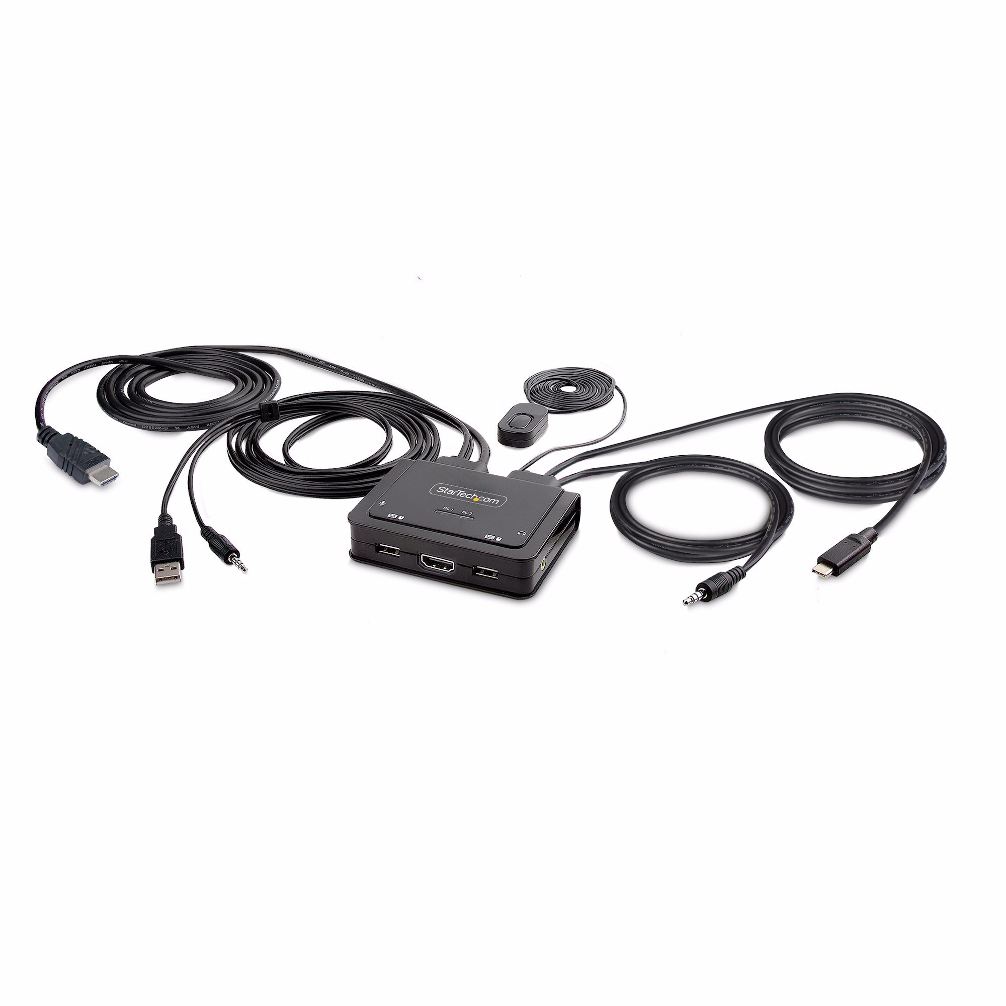 The KVM switch is bus powered and features built-in HDMI, USB-A, USB-C, and 3.5mm Audio Input/Output cables. This ensures compatibility and performance between the KVM switch, monitors, and peripherals - without the need to select and purchase the cables required for those connections.