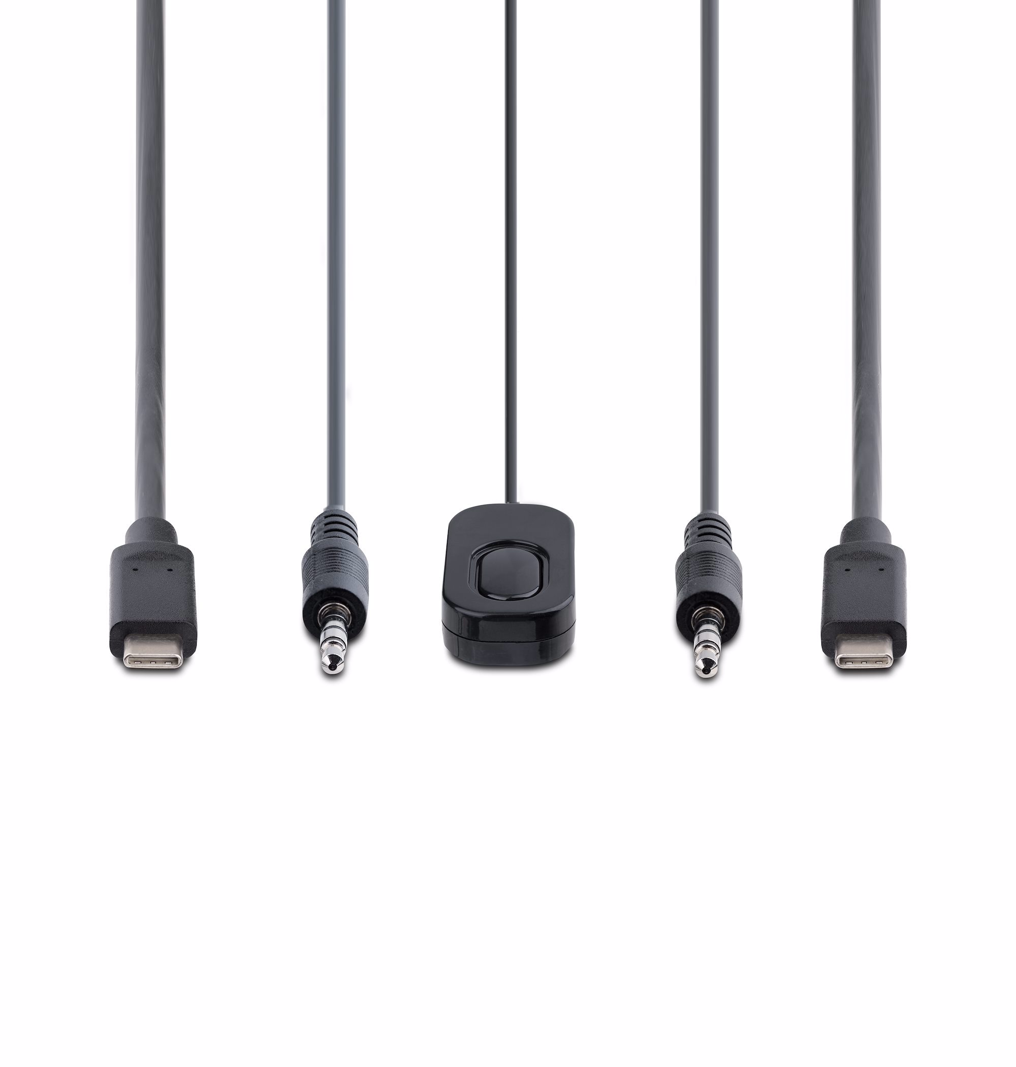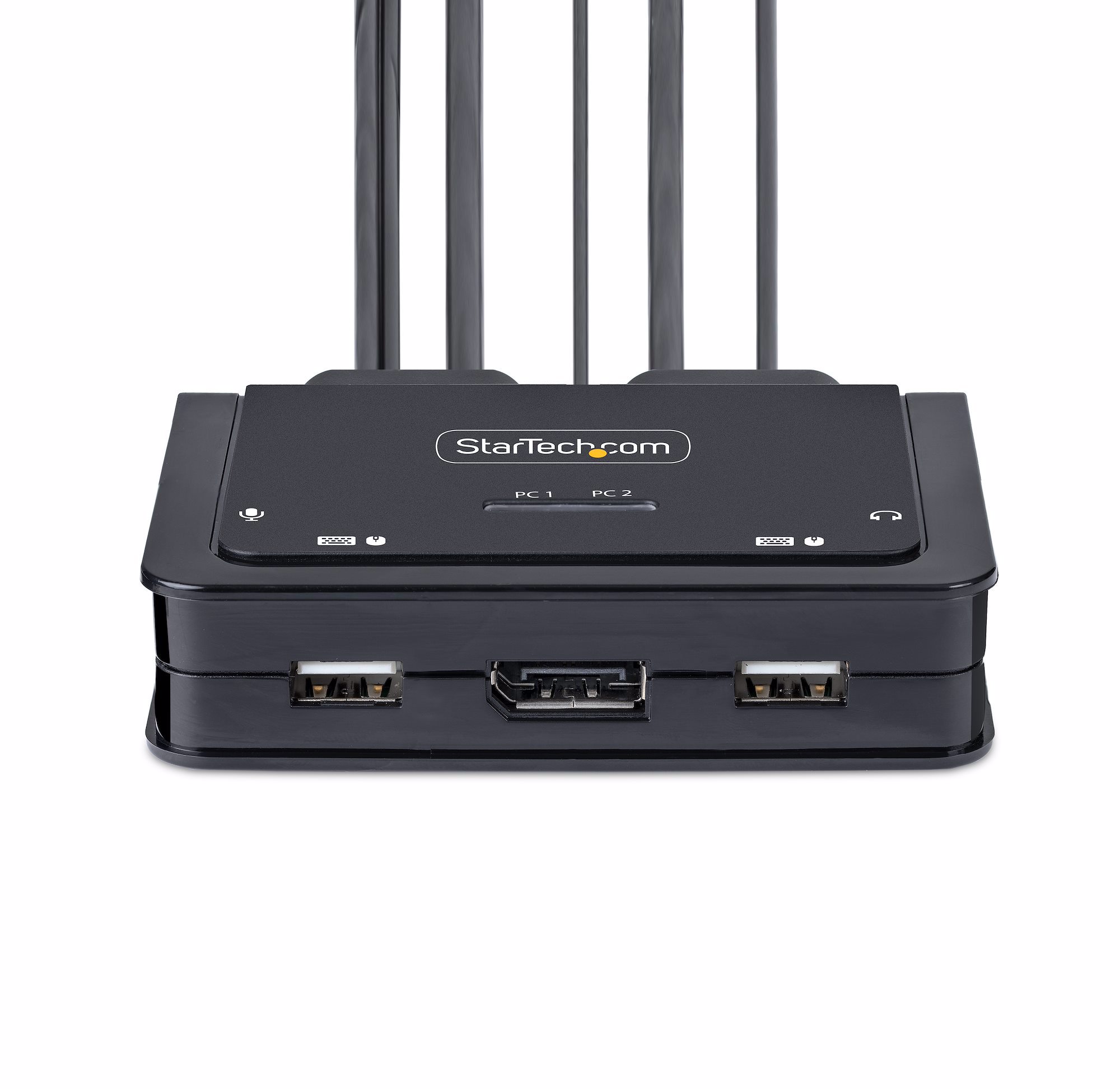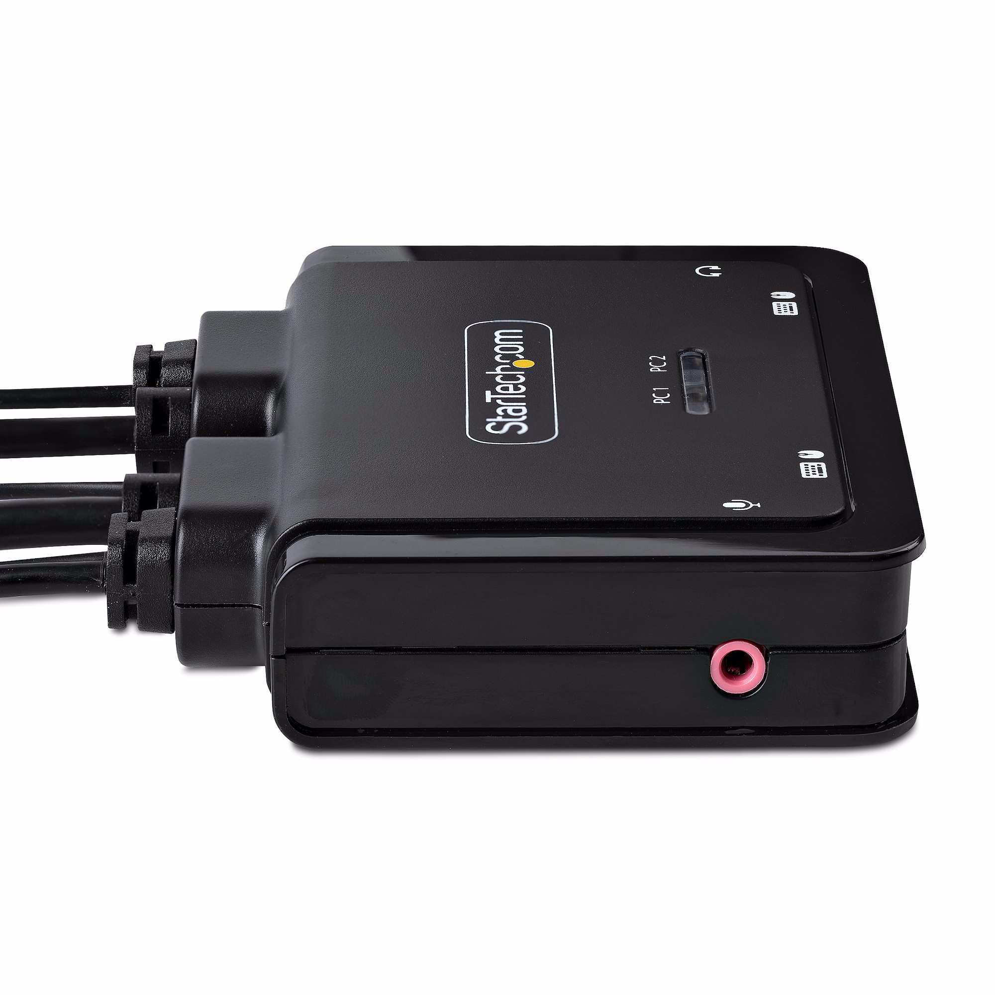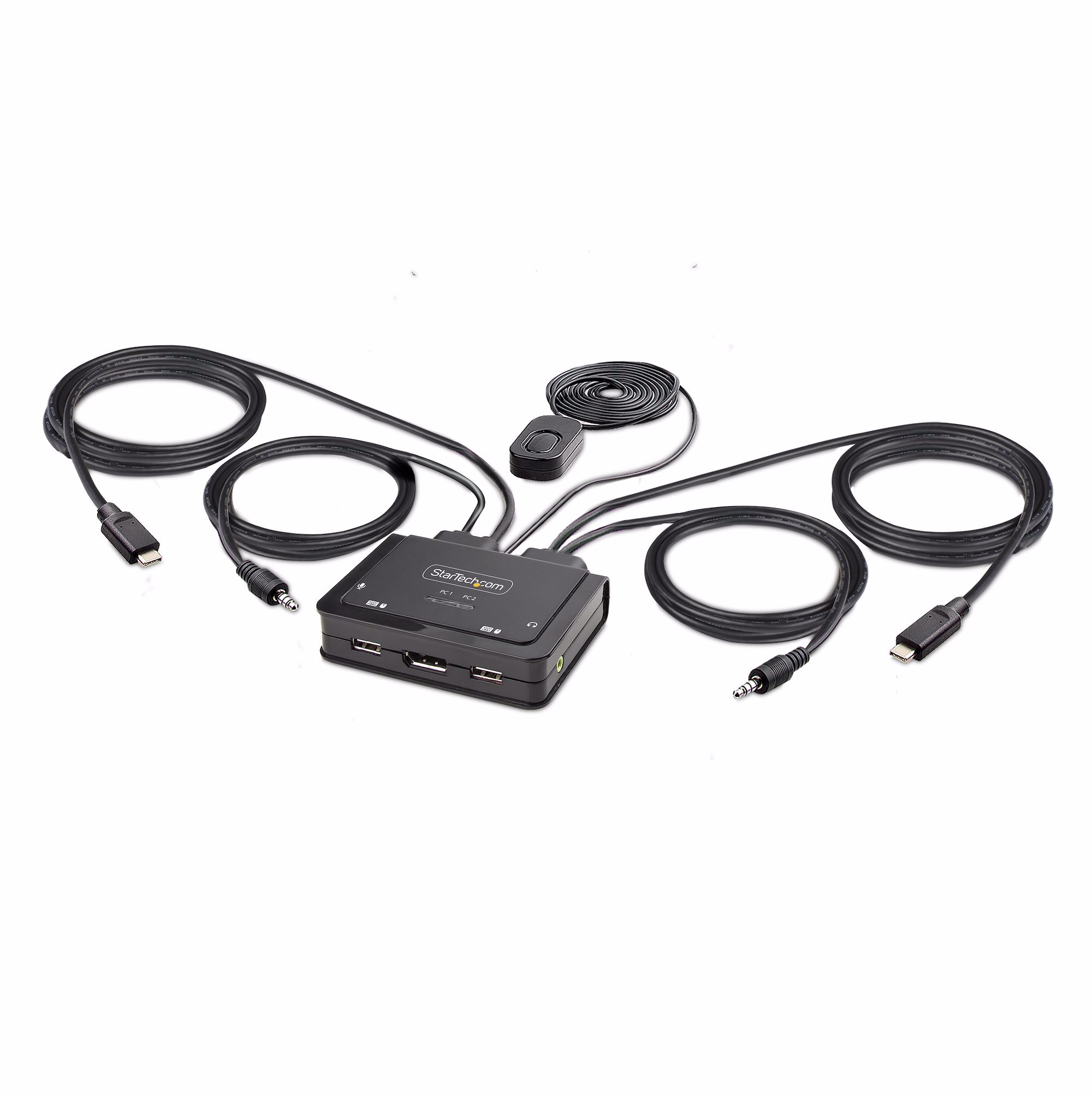 The KVM switch is bus powered and features built-in USB-C and 3.5mm Audio Input/Output cables. This ensures compatibility and performance between the KVM switch, monitor, and peripherals - without the need to select and purchase the cables required for those connections.