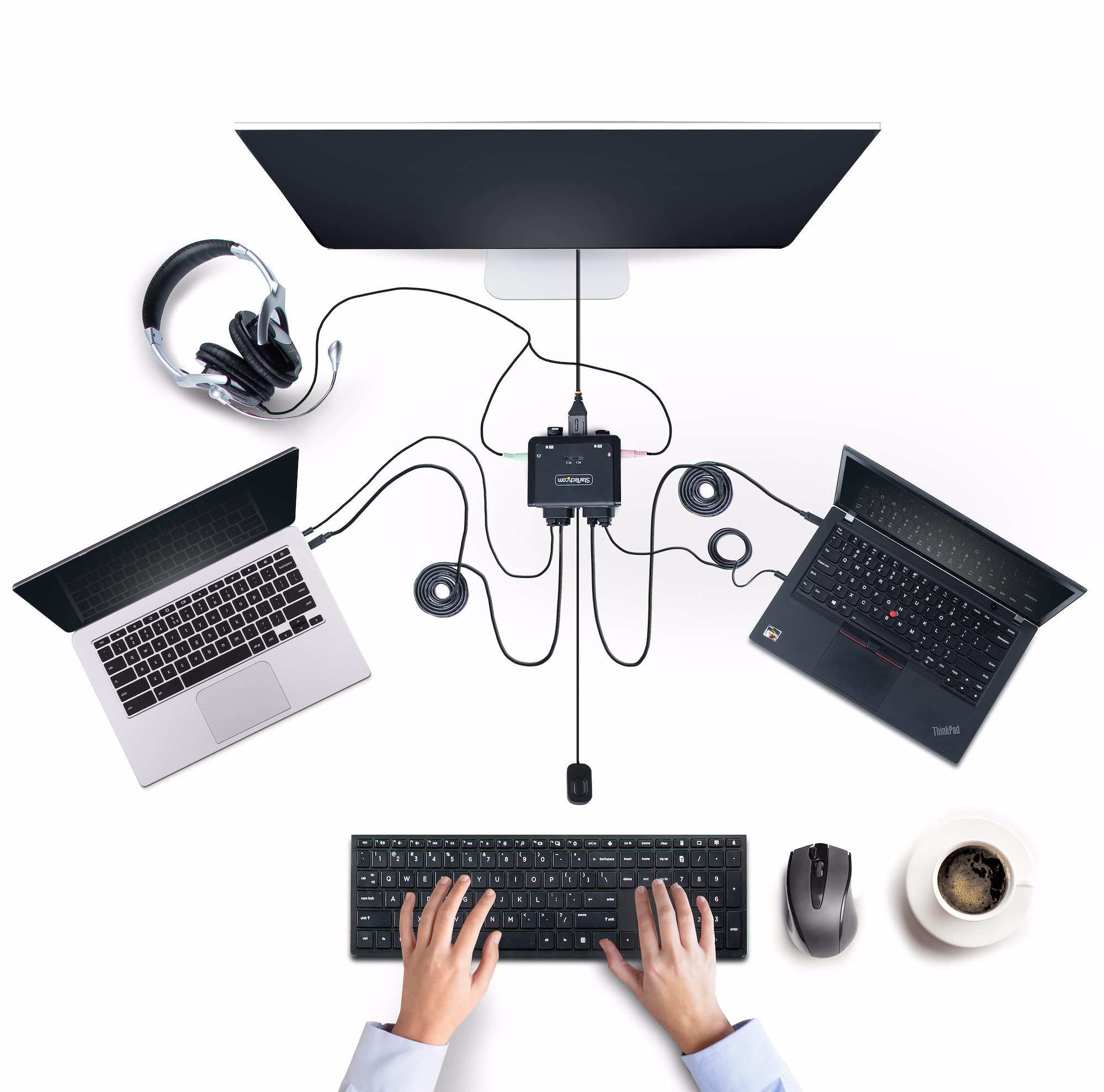 Share a mouse, keyboard, and 4K 60Hz DisplayPort display between two USB-C enabled laptops, using this KVM Switch with built-in cables