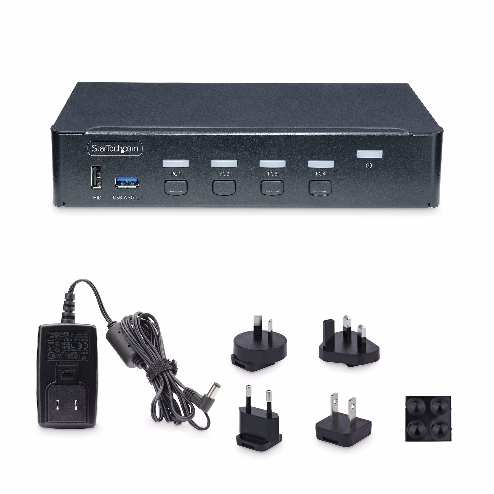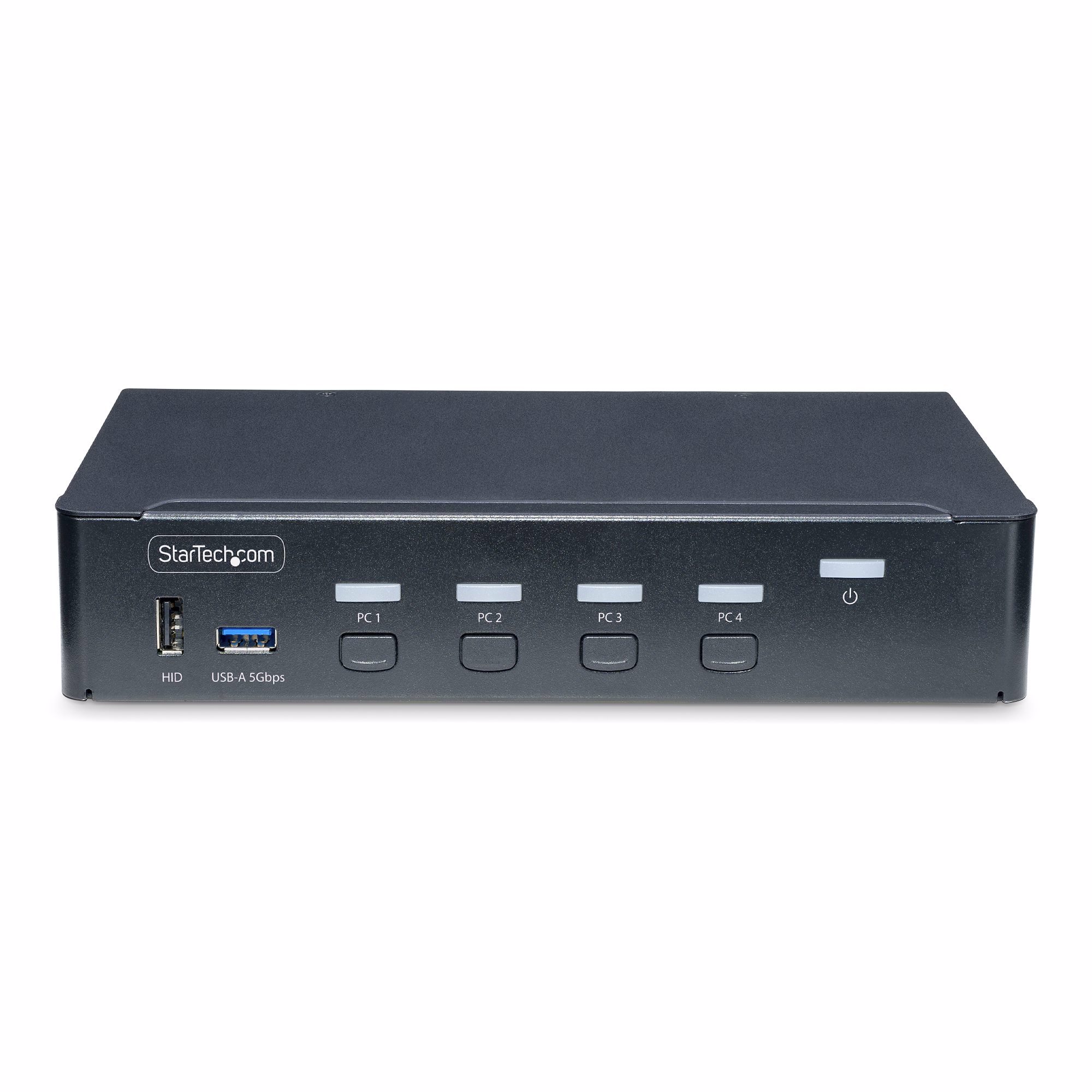 This DisplayPort KVM Switch enables users to switch between four desktops equipped with USB-A and DisplayPort. It facilitates sharing a 4K 60Hz DisplayPort monitor, a keyboard, mouse, two USB 5Gbps devices, a stereo audio output device, and four USB 2.0 devices.