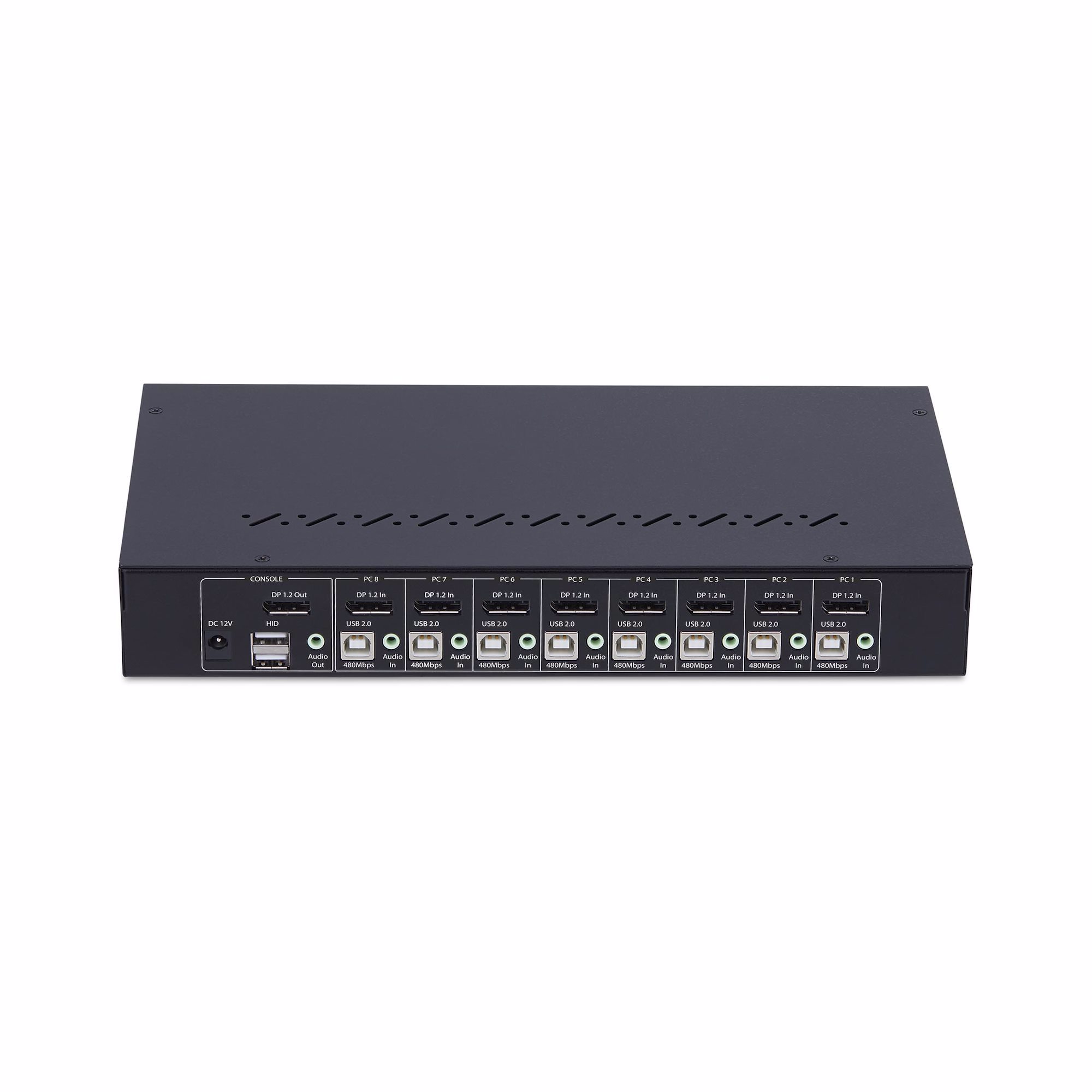 The 4K 60Hz rackmount KVM switch allows switching between eight DisplayPort-enabled computers, sharing a keyboard, mouse, audio, 4-port USB 2.0 hub, and a 4K 60Hz DisplayPort 1.2 monitor. This enables effortless multi-system management, improved workspace efficiency, and enhanced productivity.