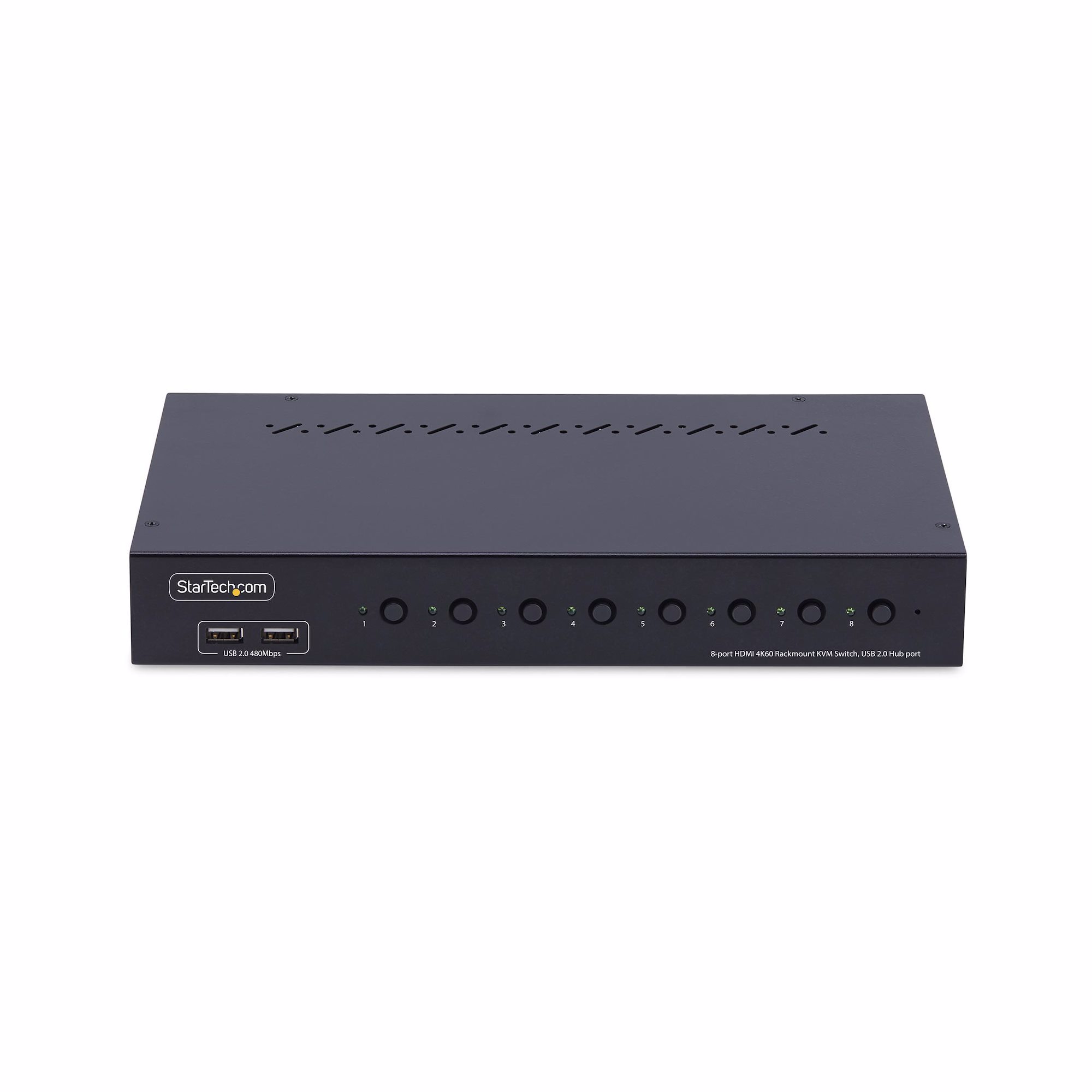 The 4K 60Hz rackmount KVM switch allows switching between eight HDMI-enabled computers, sharing a keyboard, mouse, audio, 4-port USB 2.0 hub, and a 4K 60Hz HDMI 2.0 monitor. This enables effortless multi-system management, improved workspace efficiency, and enhanced productivity.