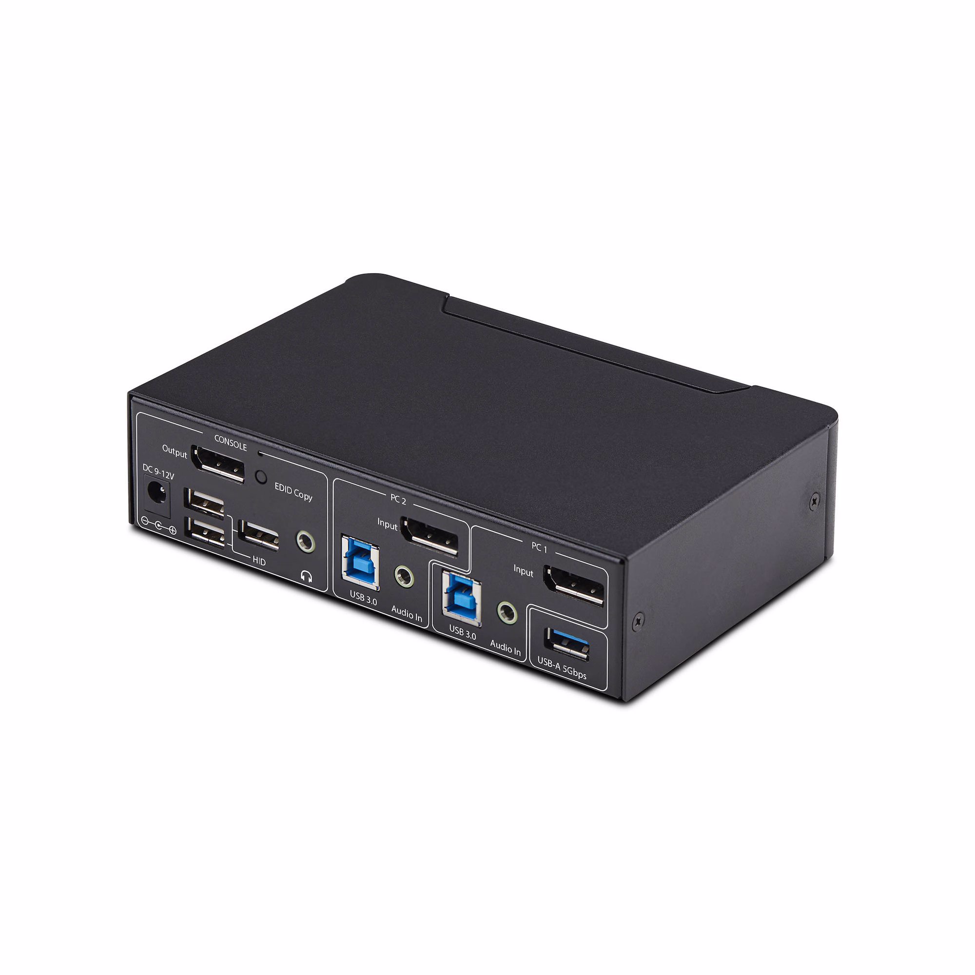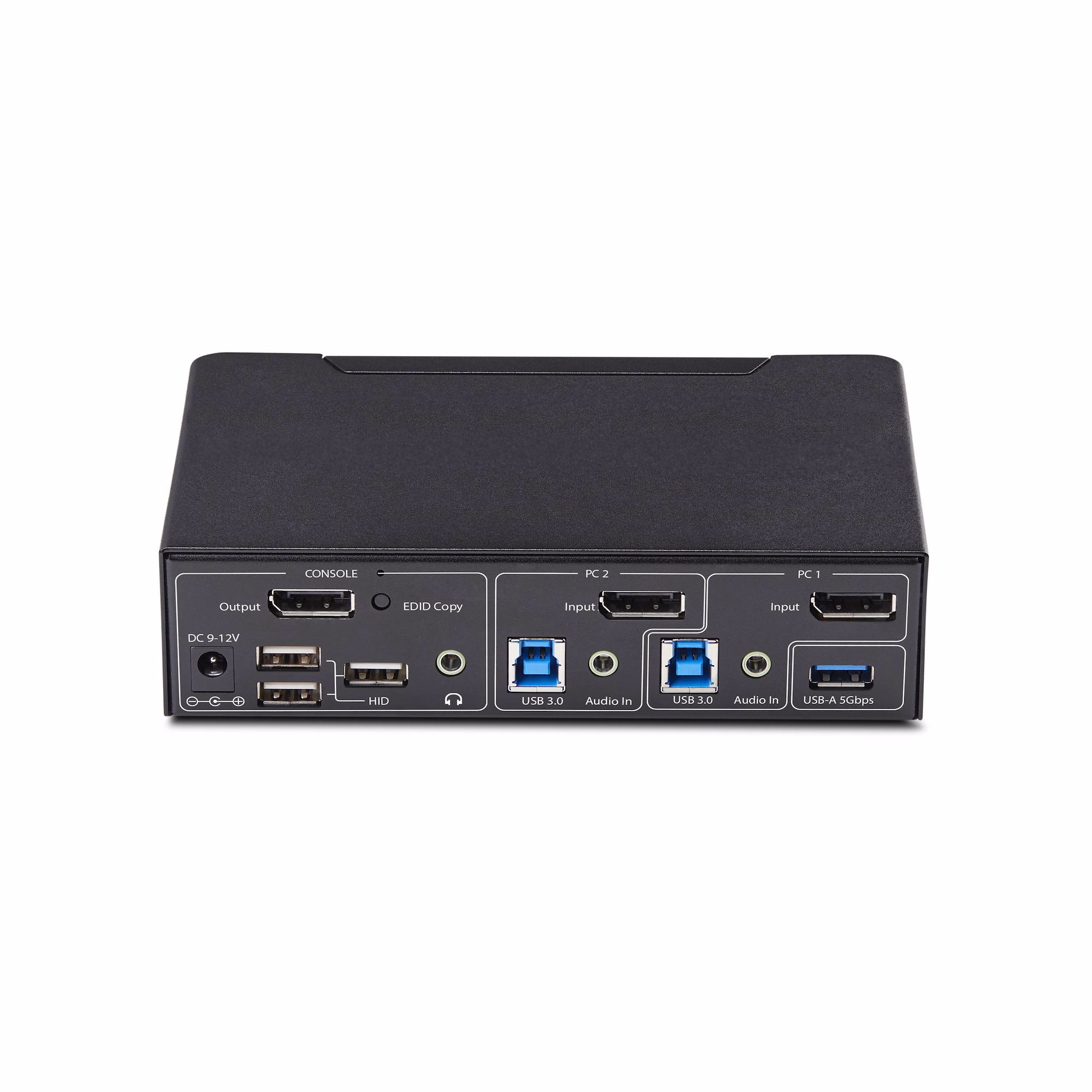 Share a mouse, keyboard, USB 5Gbps hub, and 4K 60Hz DisplayPort display between two DisplayPort-enabled computers, featuring EDID Emulation and HDCP engine