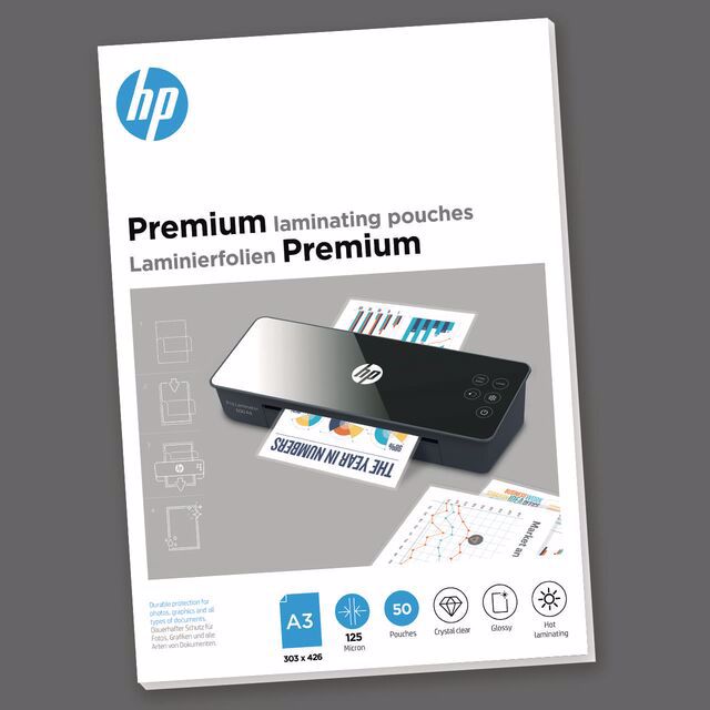 Protect your A3 documents from wear and tear and give them a high-quality feel with HP Premium laminating pouches. The 303 mm x 426 mm transparent films have a glossy finish and are suitable for hot lamination only. With a film thickness of 125 microns, they are suitable for all HP OneLam and HP Pro Laminators which can handle the DIN A3 format. Of course, they are also compatible with hot laminators of other manufacturers, provided that the specified micron number is not exceeded. The laminating pouches are available in a folding box with 50 pieces. By the way: The HP Premium laminating pouches in DIN A3 are also available in 80 microns and 250 microns.