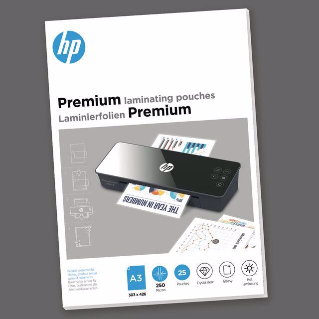 The absolute highlight of the HP premium laminating pouches are these particularly thick films with a thickness of a whopping 250 microns. With dimensions of 303 mm x 426 mm, they are ready to take on the really large tasks in A3 format and make your documents impress with an elegant feel. Due to their size and the thickness of the film, the laminating pouches are only suitable for the HP series HP Pro Laminator 1500 A3 . Of course, the films are also compatible with hot laminating devices of other manufacturers, as long as the micron number specification is not exceeded. The transparent laminating foils with glossy surface can only be used for hot lamination and are available in a pack of of 25 pieces.