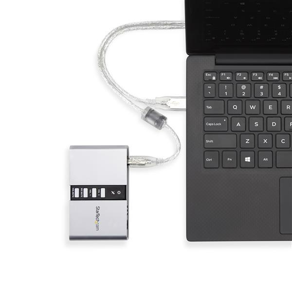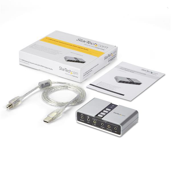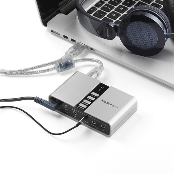 Providing a robust USB audio experience, the USB sound card connects to a host computer through a single USB 2.0 connection, to deliver impressive external audio capability that can instantly be swapped between systems, without having to open the computer case for installation.