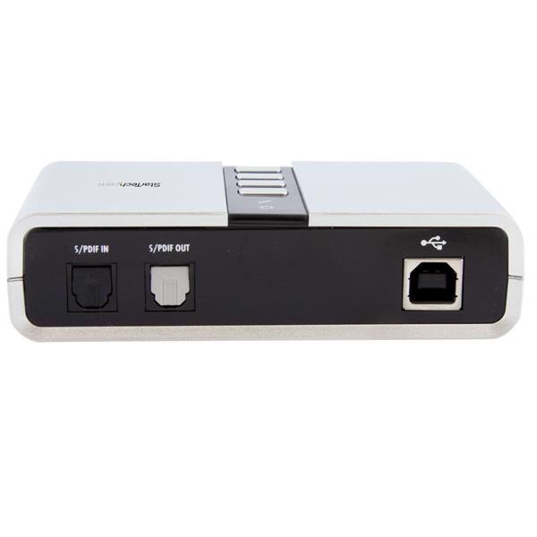 The external USB sound card features easy-to-use volume control and two external microphone inputs - a convenient solution for any audio application requiring high quality sound with multi-input capability with support for 44.1 KHz and 48 KHz sampling rates for analog playback and recording or 48 KHz for SPDIF.