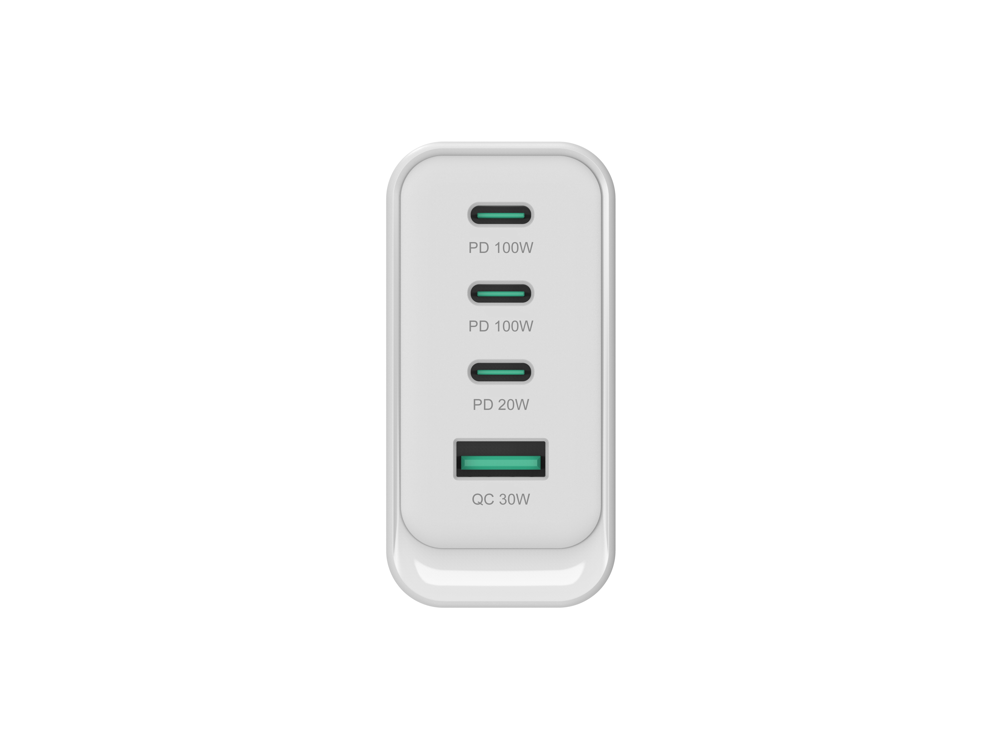 This charger harnesses cutting-edge Gallium Nitride (GaN) technology to deliver up to 100W of total power, ensuring exceptionally fast and efficient charging. It features a versatile port selection with 4 ports: 3 USB-C ports supporting Power Delivery (PD) 3.0 and 1 USB-A port with Quick Charge (QC) 3.0. This configuration allows for simultaneous charging of multiple devices with varying power requirements. The charger supports a wide range of output options from 3.3V to 20.0V, ensuring compatibility with everything from smartphones to laptops. Enhanced safety is provided through built-in protections against overload, short-circuiting, and overheating, safeguarding both the charger and your devices. It incorporates USB Power Delivery (PD) 3.0 and Quick Charge (QC) 3.0 technologies for rapid charging and features Programmable Power Supply (PPS) compliance to optimize charging efficiency while minimizing heat generation.