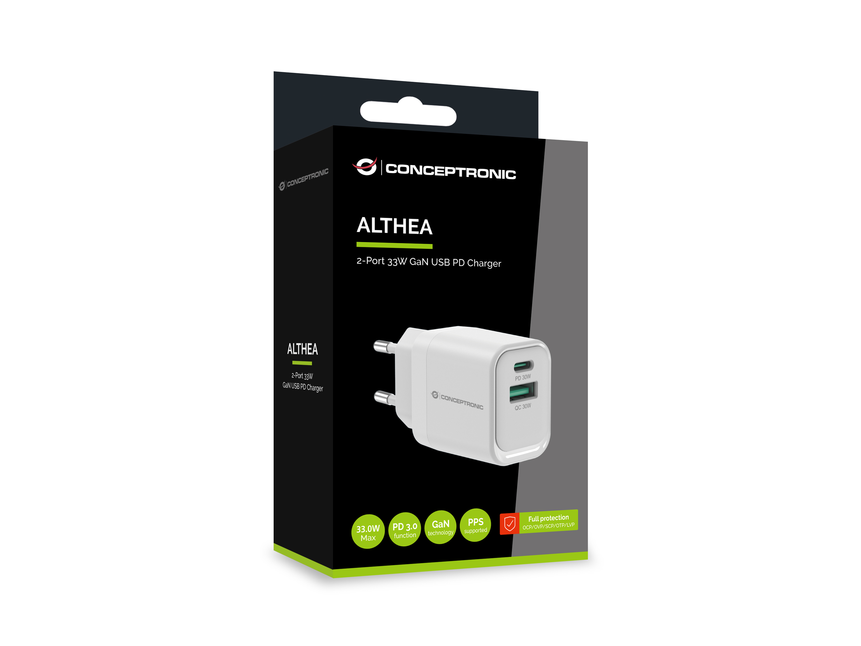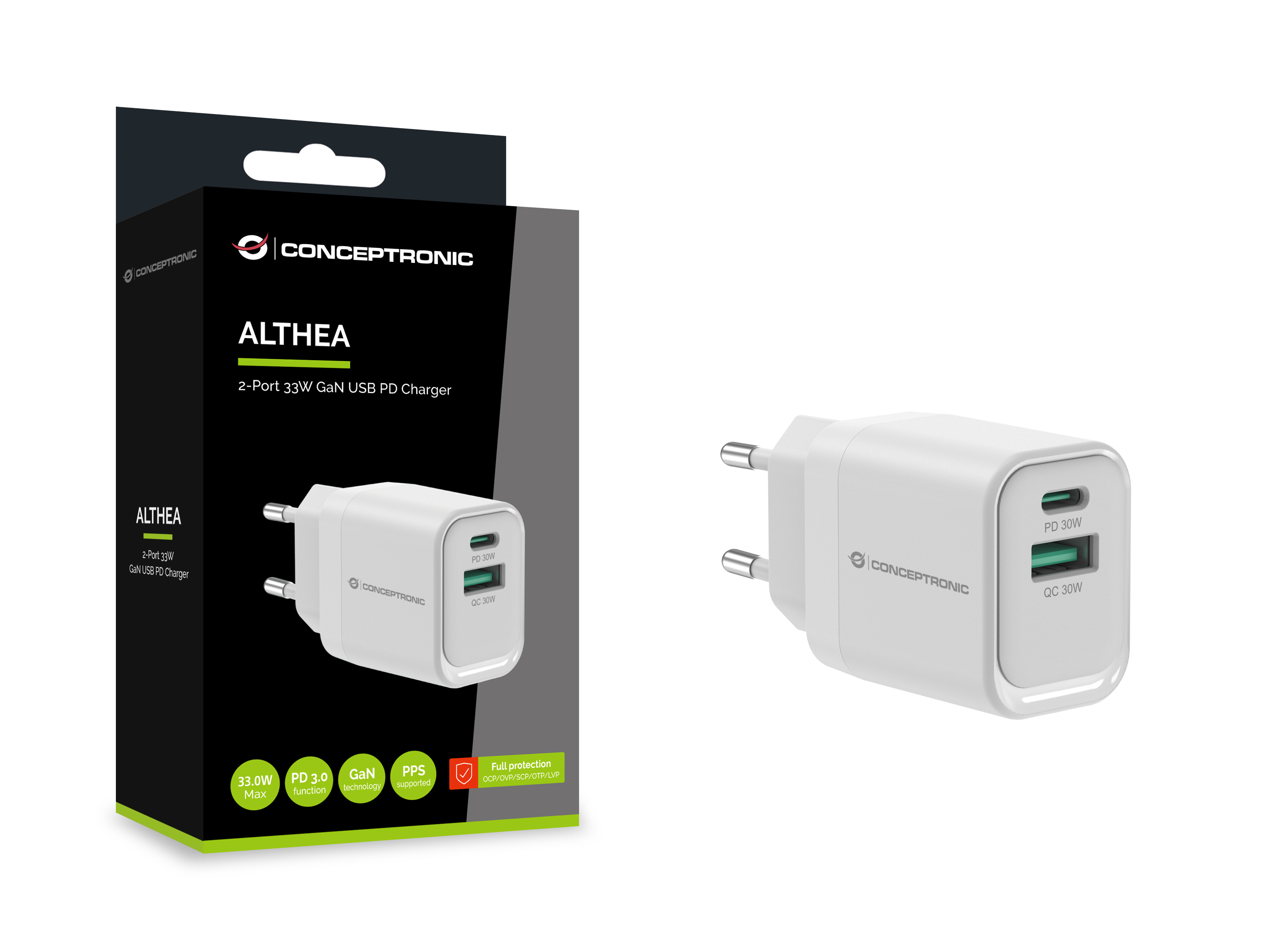 This charger leverages advanced Gallium Nitride (GaN) technology to provide up to 33W of total power, delivering faster and more efficient charging. It features a versatile port selection with 1 USB-C port supporting USB Power Delivery (PD) 3.0 and 1 USB-A port with Quick Charge (QC) 3.0, allowing for simultaneous charging of multiple devices with different power needs. The charger supports a wide range of output options from 3.3V to 20.0V, ensuring compatibility with a variety of devices, including smartphones and laptops. Enhanced safety is ensured with built-in protections against overload, short circuiting, and overheating. Additionally, it incorporates USB Power Delivery (PD) 3.0 and Quick Charge (QC) 3.0 technologies for rapid charging, along with Programmable Power Supply (PPS) compliance to maximize efficiency and minimize heat generation.