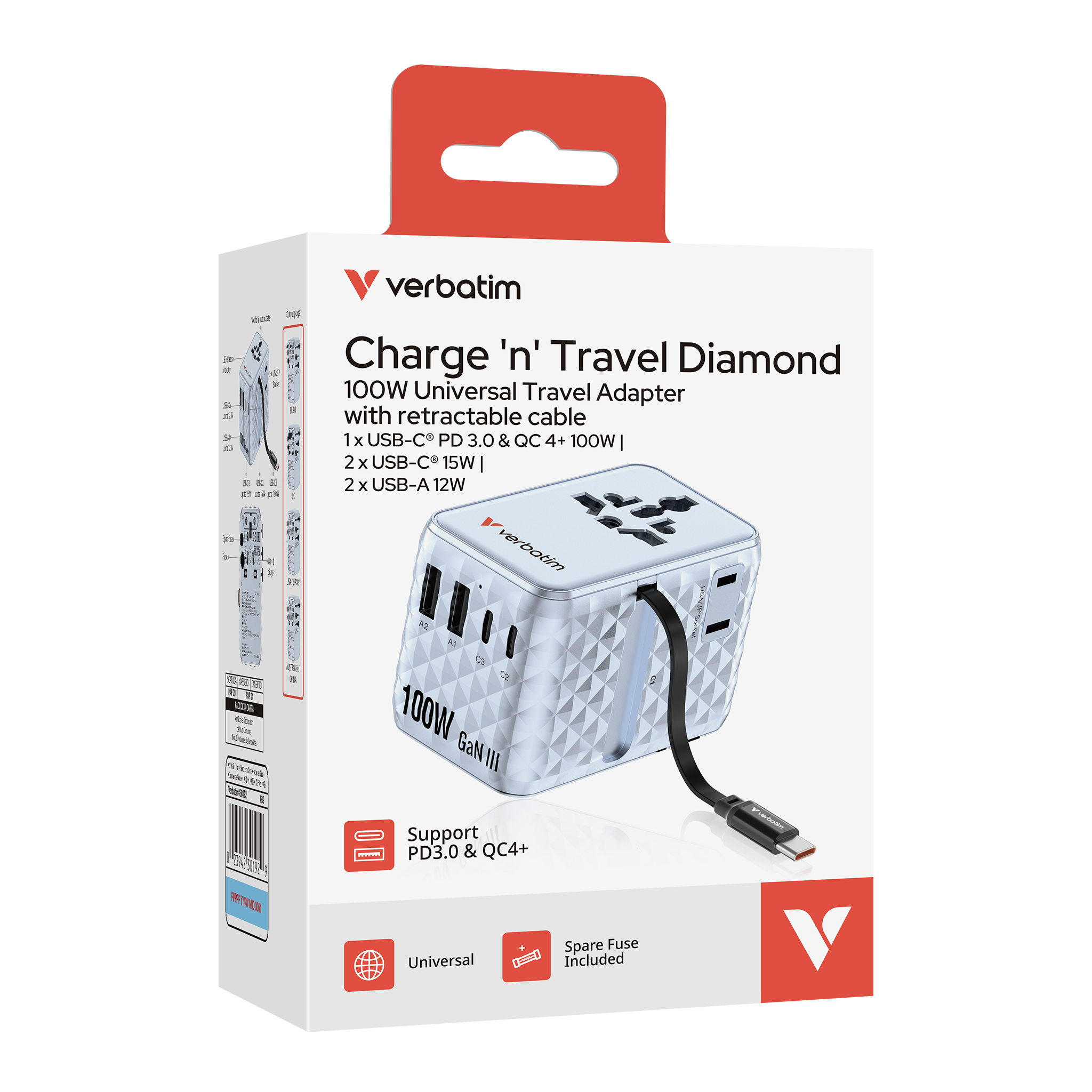 Equipped with 7-in-1 functionality and support for up to 100W output, this adapter has the capacity to charge your entire digital kit. Use the AC sockets for standard plugs, the retractable USB-C cable for quick access, and the four USB ports to top off additional devices. With GaN III technology, you get the same powerful performance with better energy efficiency, a cooler operation, and a smaller footprint – ideal for anyone needing fast, flexible charging across borders.