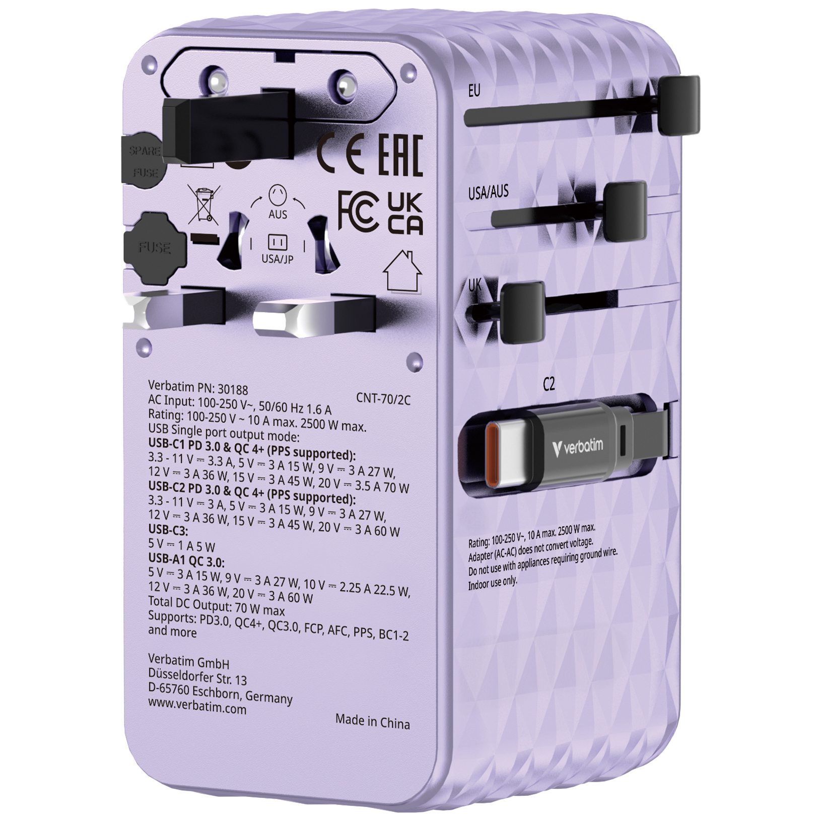 Say goodbye to messy wires and forgotten cords. The Charge ‘n’ Travel 70W GaN III Adapter comes equipped with two integrated retractable USB-C cables, built directly into the device. This innovative feature keeps everything compact and tangle-free, while still offering powerful charging on-the-go. Whether you're hopping between hotel rooms or working in cafes, your essential cables are always within reach – no more rummaging through bags. Combined with universal plug support, this adapter is your new travel essential.
