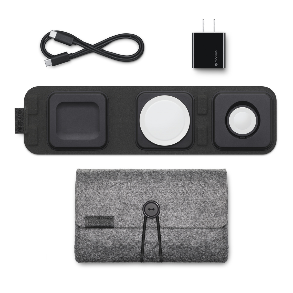 Upgrade your on-the-go power. The 3-in-1 travel charger with MagSafe has dedicated charging spots for your iPhone, Apple Watch, and AirPods. The magnetic surface means you’ll hit the charging sweet spot every time. No more searching for different outlets around the room. The 3-in-1 travel charger keeps you fully charged and organized whether you’re on vacation or traveling for business. The travel kit comes with everything you need including a USB-C cable and wall adapter. Simplify packing with one handy kit that fits neatly in your bag.