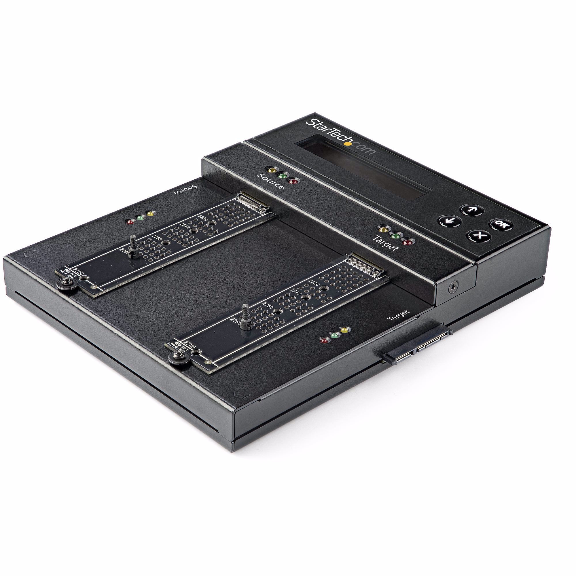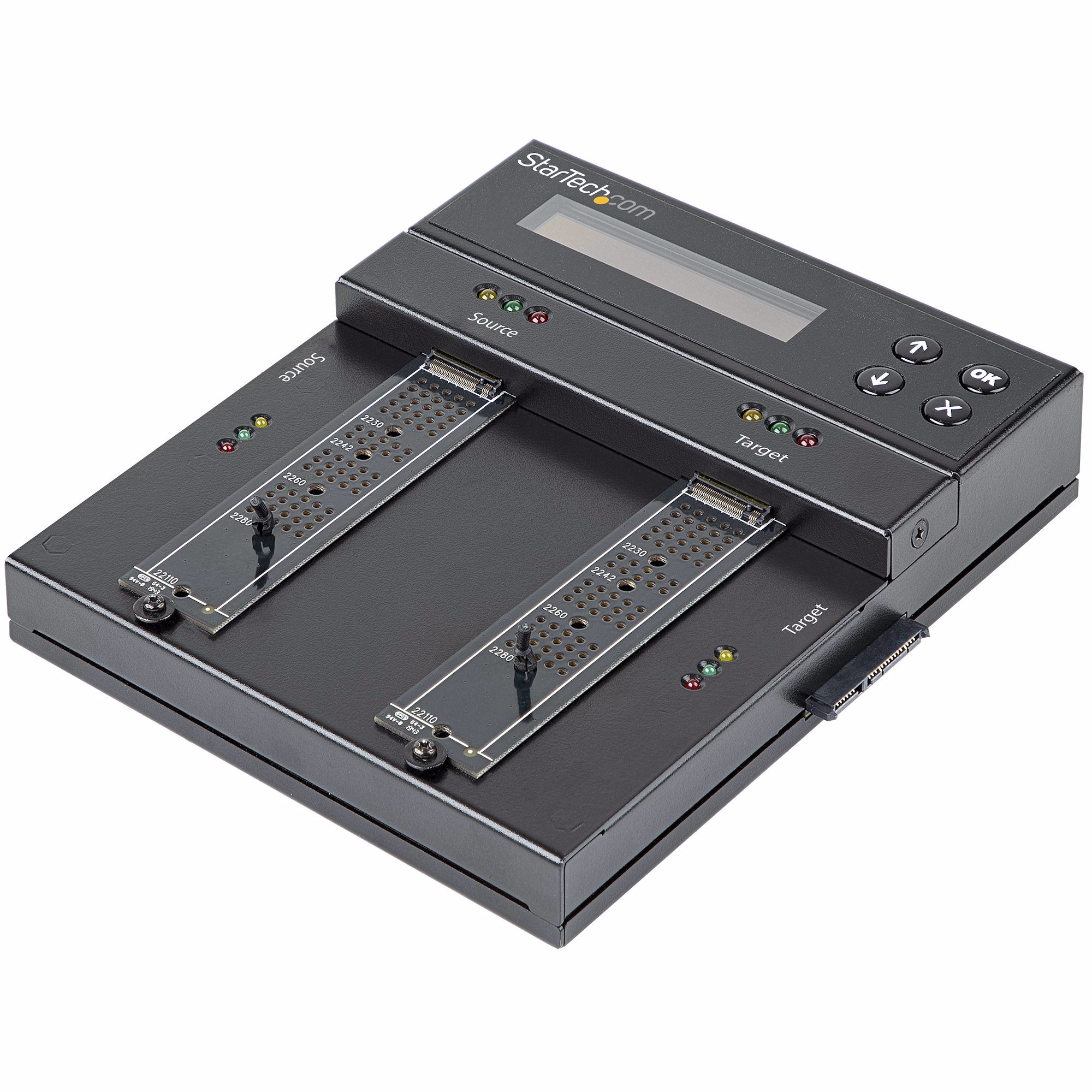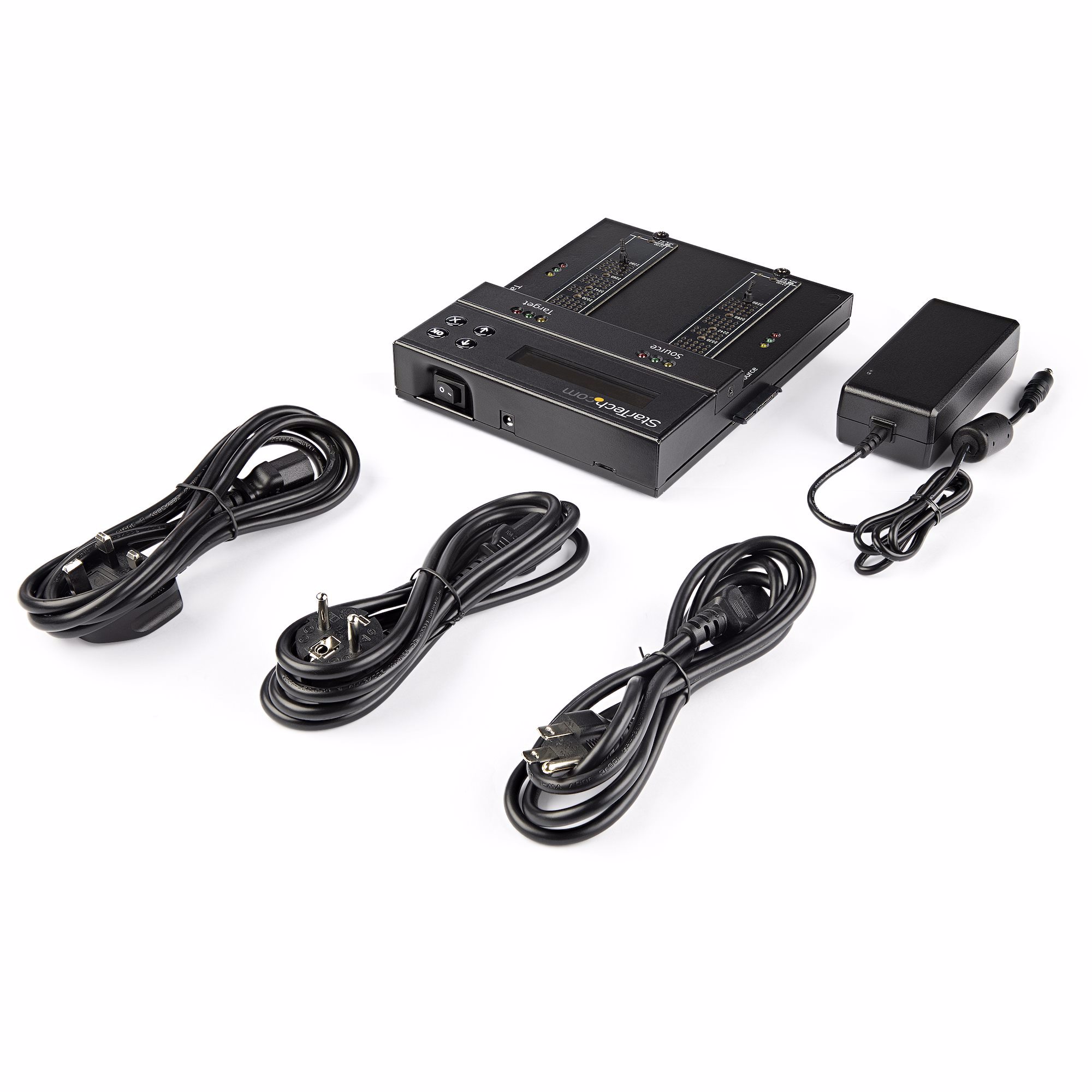 Supporting different types of drives including M.2 PCIe (M-Key), M.2 SATA (B+M-Key), and SATA 2.5/3.5 in. drives, this HDD/SSD cloner and wiper provides a versatile solution for drive cloning and deleting applications. The drive cloner enables duplication with any combination of drives, supporting duplication between M.2 (NVMe/AHCI), M.2 SATA, and 2.5/3.5" SATA drive interfaces. You can also expand the capabilities of the device to supporting IDE and mSATA drives using StarTech.com drive adapters: SATA to IDE Adapter (SAT2IDEADP) / SATA to mSATA Adapter (SAT32MSAT257) (each sold separately).