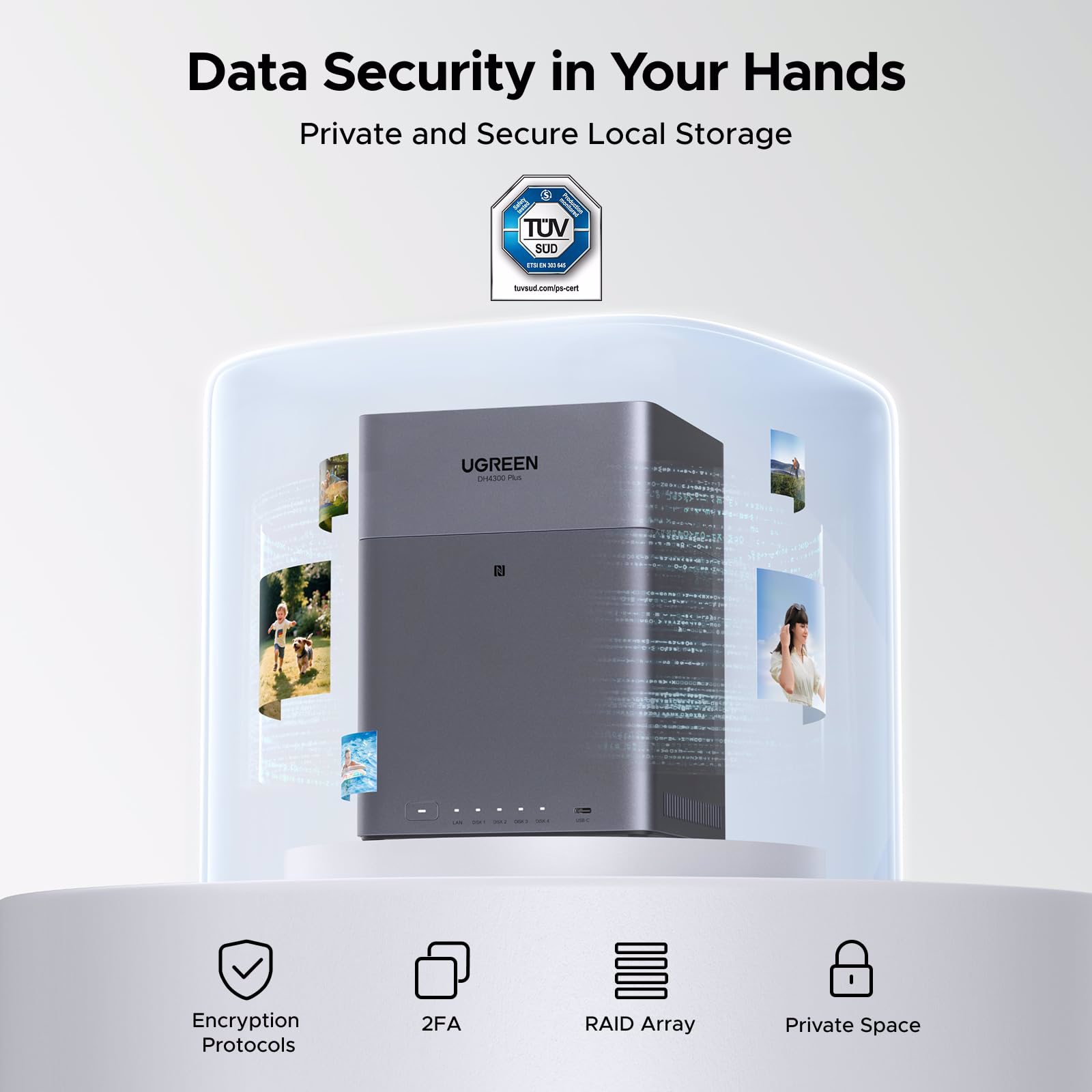 Your Data, You Control:No third-party clouds, no hidden access, UGREEN NAS provides a more secure and private data storage solution. It stores data locally on your private hard drives and does automatic backups. Thus, you can keep full control over it. The advanced encryption is TRUSTe certified in the United States and is awarded the first (and only) ETSI EN 303 645 certification mark for NAS products by TÜV SÜD Group.